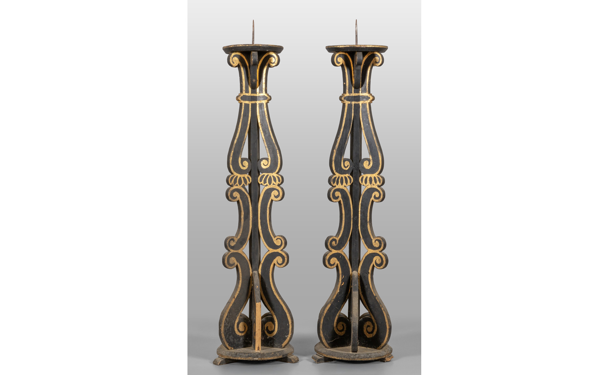 Coppia di torciere in legno traforato dorato e laccato Italia Meridionale sec.XIX