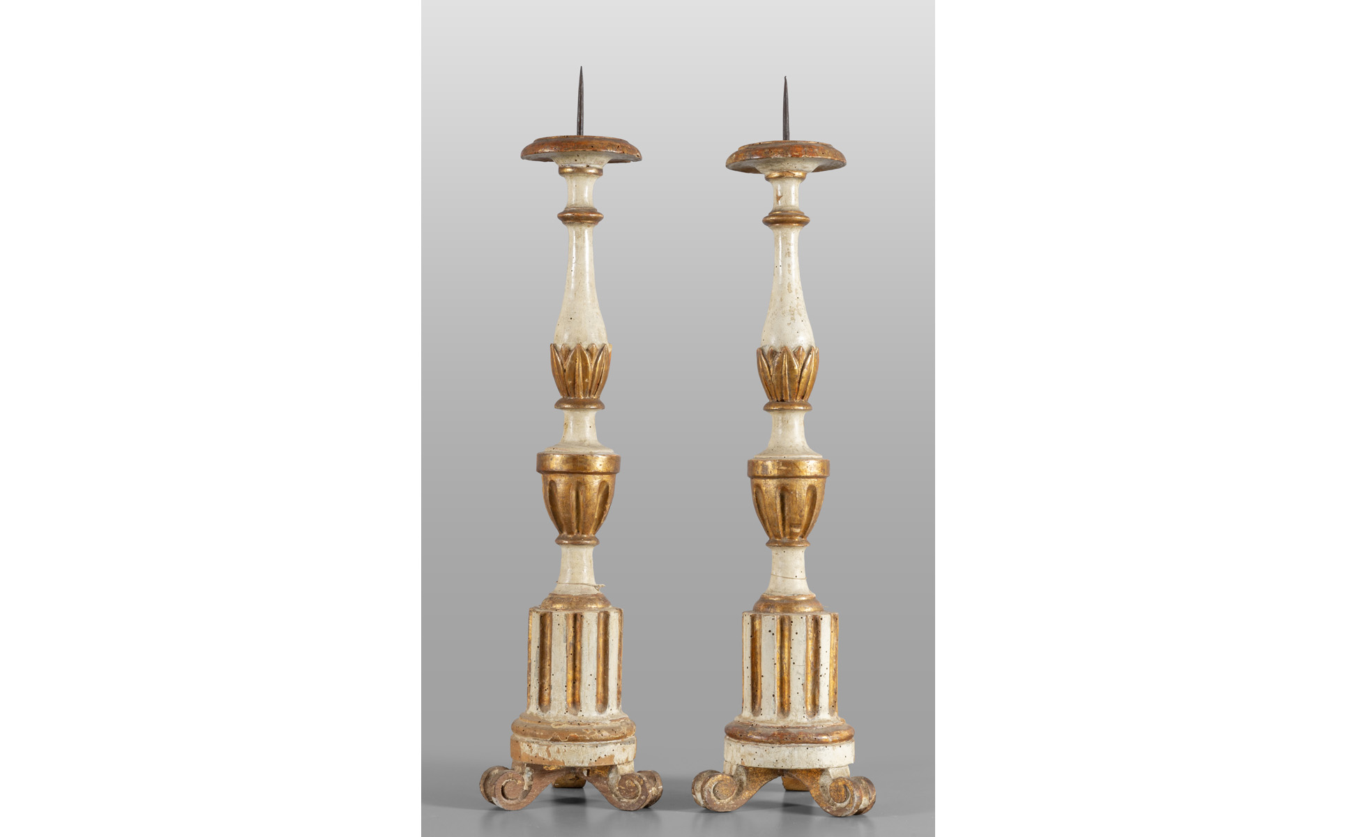 Coppia di candelieri in legno intagliato laccato e dorato fine sec.XVIII