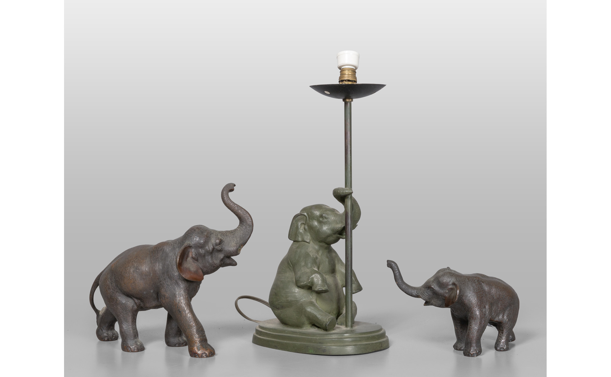 Tre sculture in bronzo raffiguranti elefanti di cui una montata a lampada