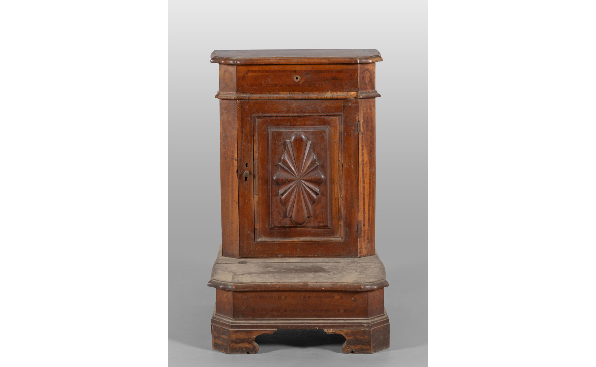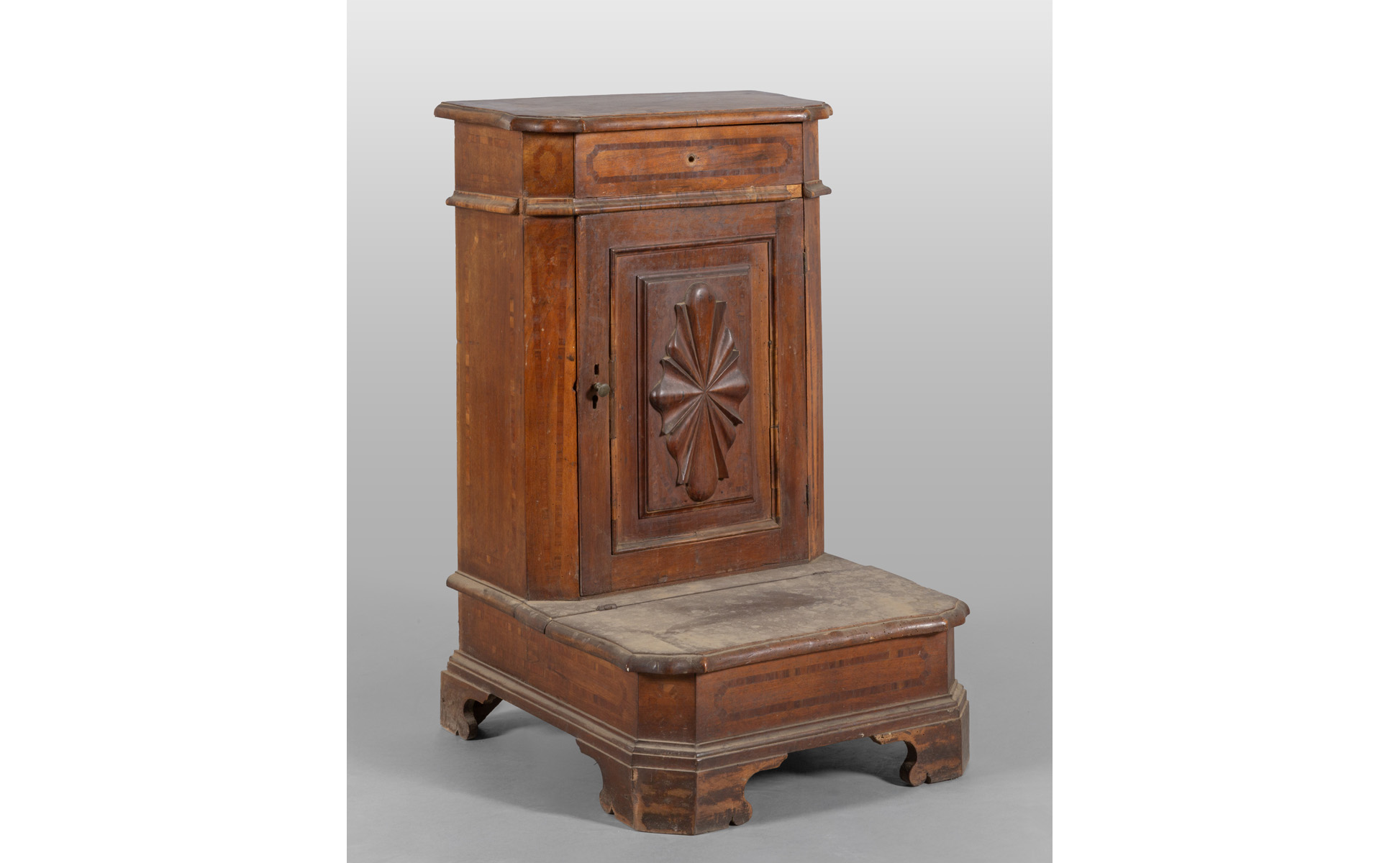 Inginocchiatoio Luigi XIV in noce filettato in legno di rosa ad un cassetto e uno sportello Genova I metà sec.XVIII