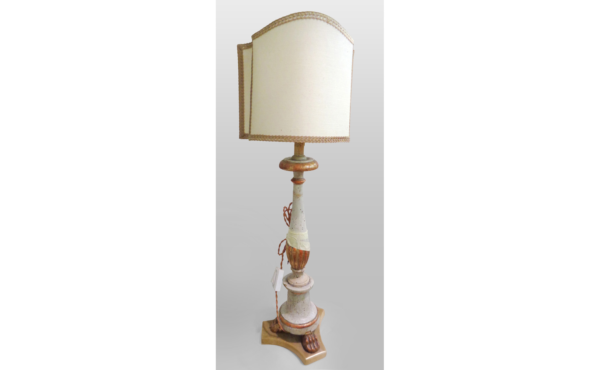 Candeliere Luigi XVI in legno intagliato laccato e dorato a tutto tondo adattato a lampada sec.XVIII