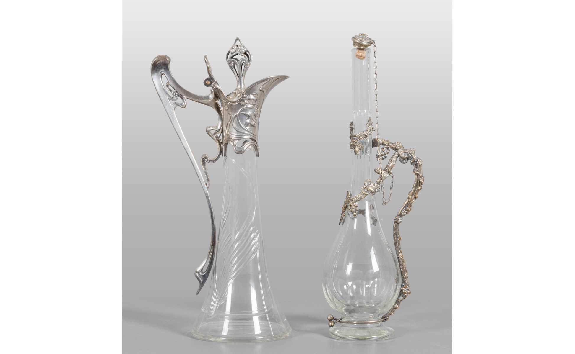 Due bottiglie Liberty in cristallo con impugnature in metallo argentato sec.XX