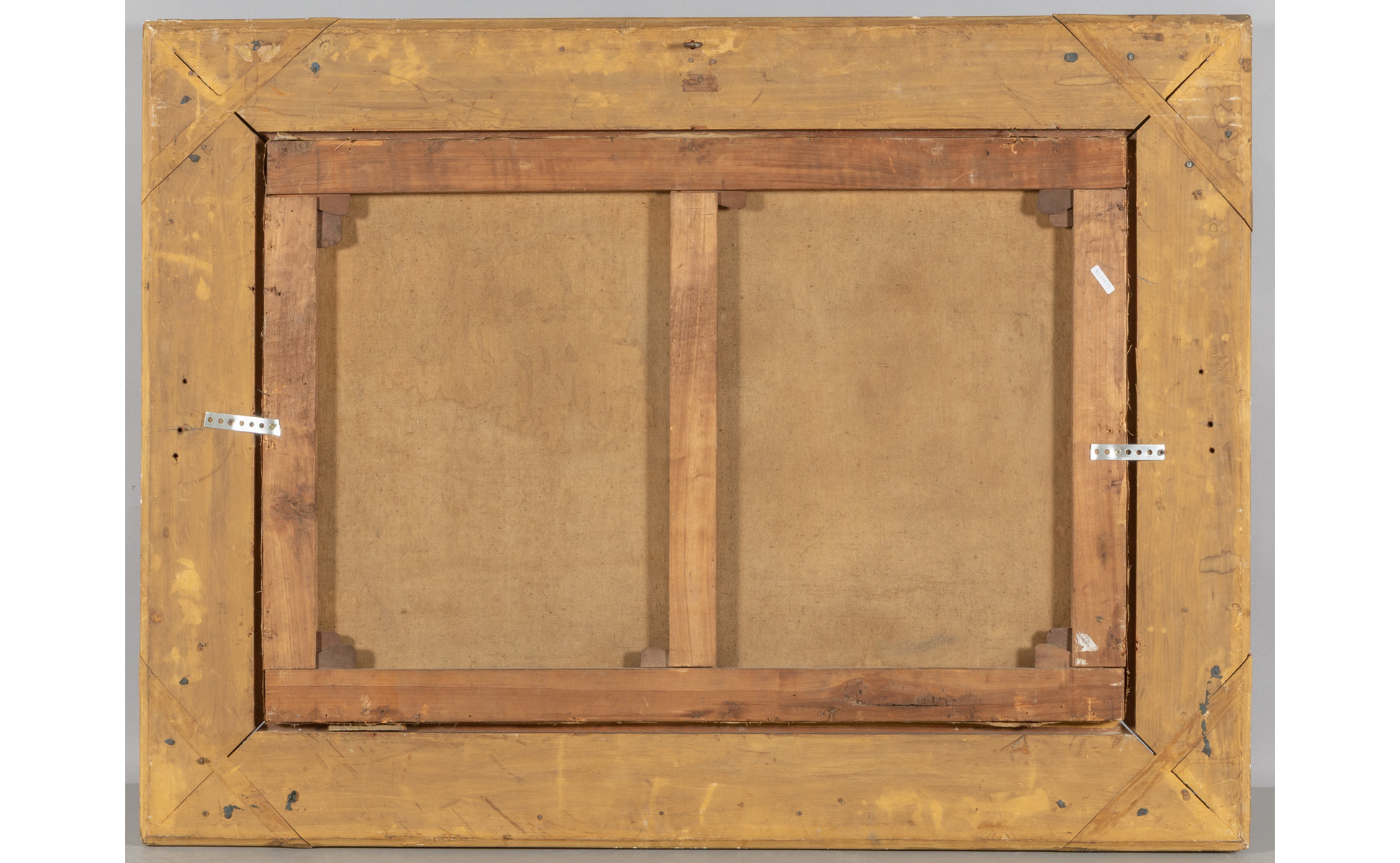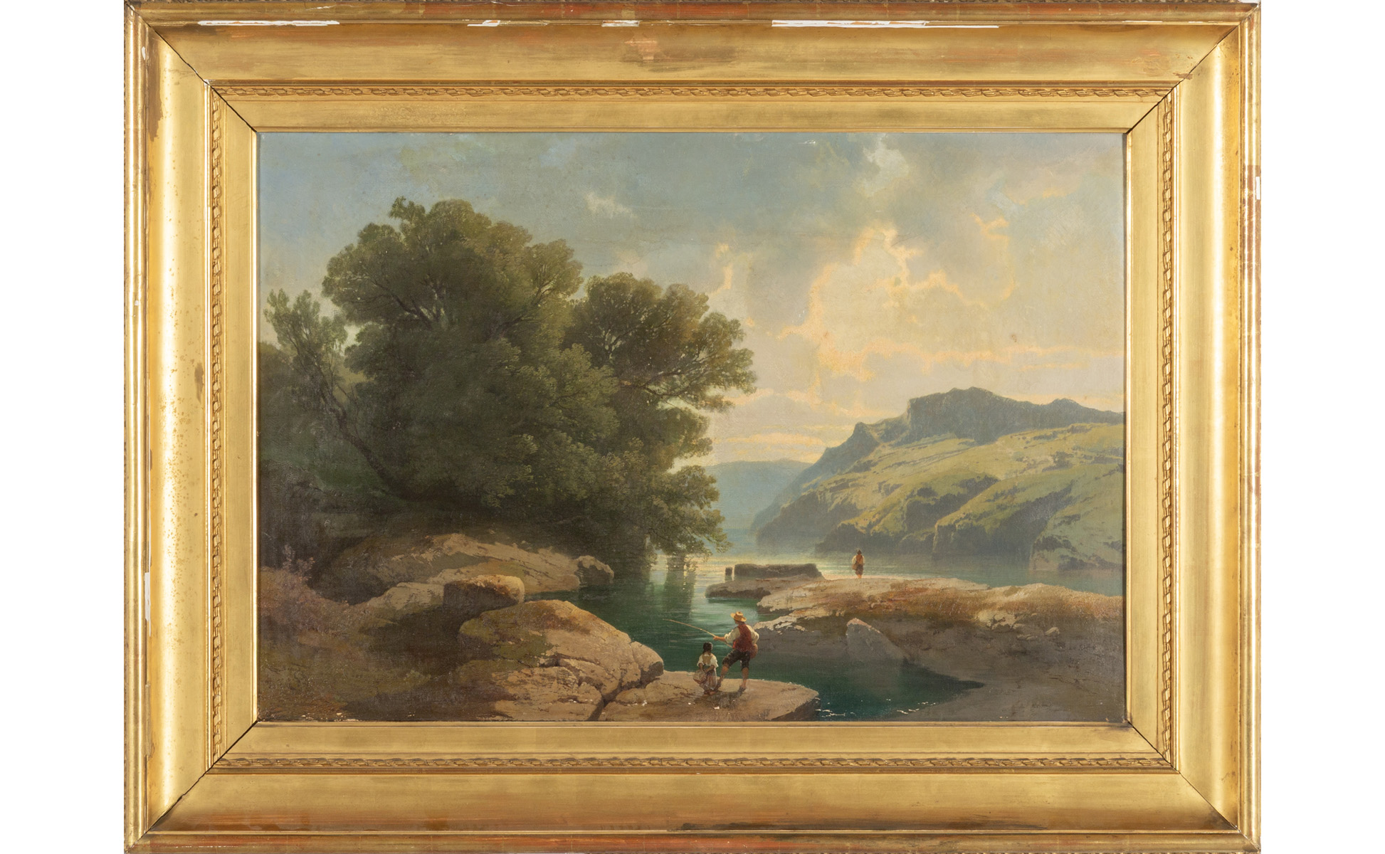 Scuola iataliana sec.XIX 'Paesaggio con barcaiolo' olio cornice coeva in legno intagliato e dorato