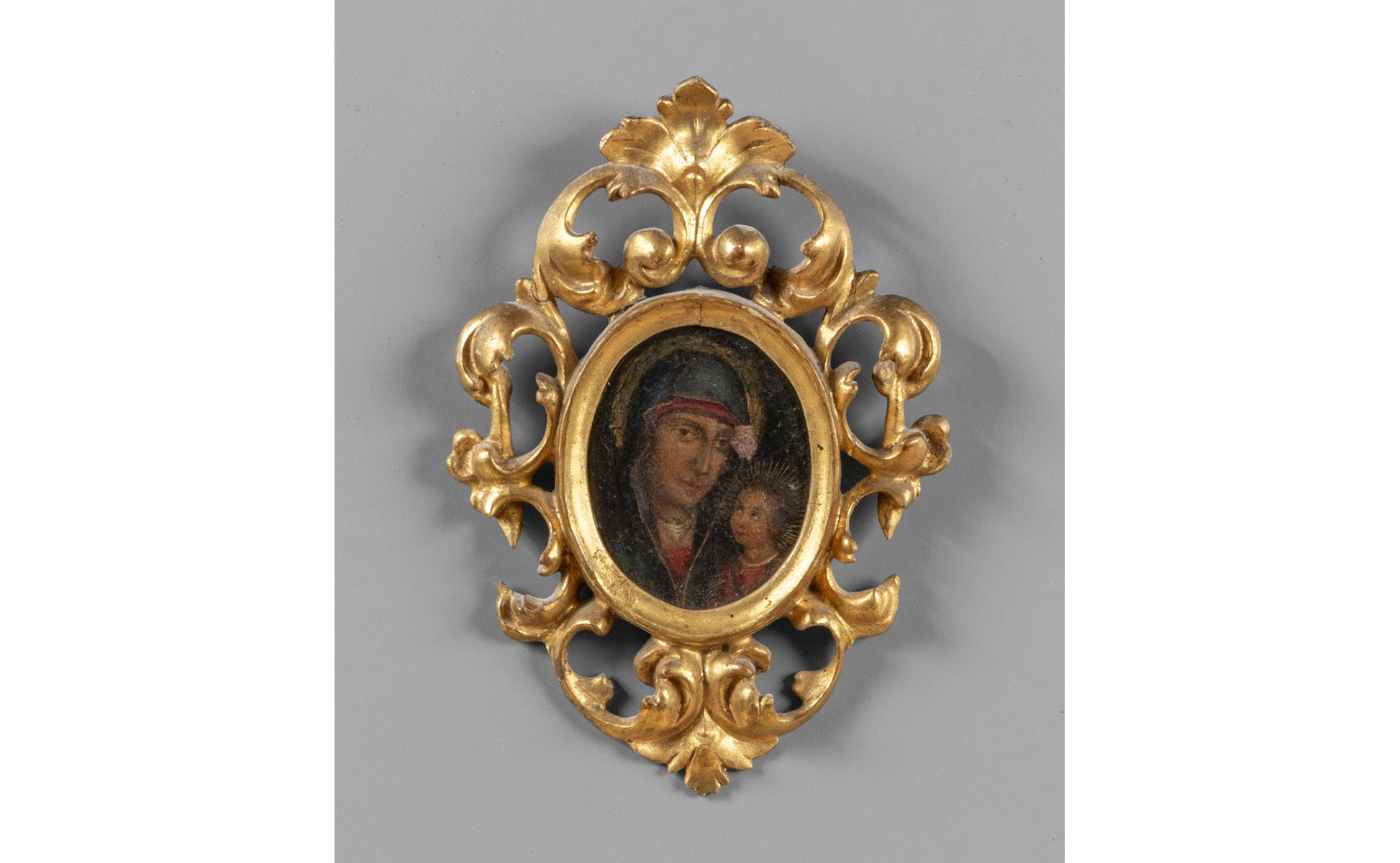 'Madonna con Bambino' olio su rame in cornice in legno intagliato e dorato fine sec.XVIII