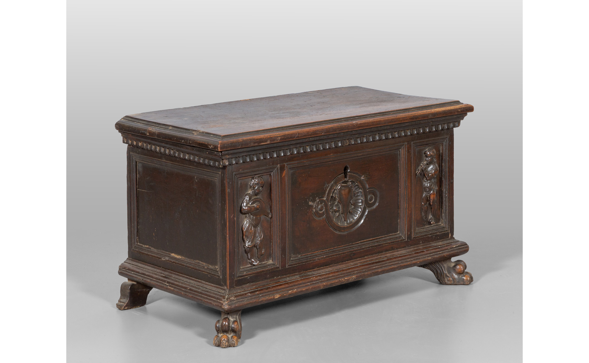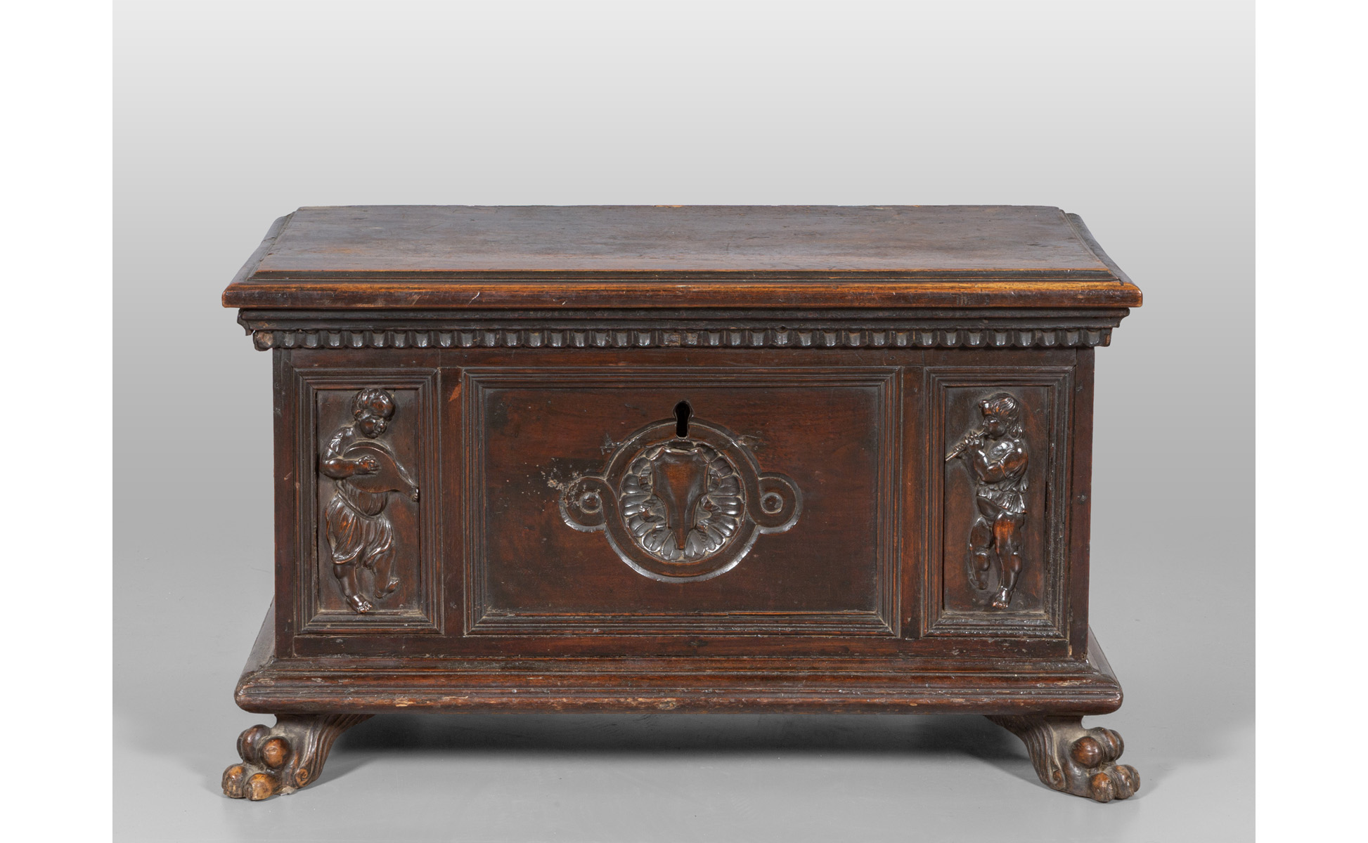 Modello di cassapanca in noce finemente intagliato con bambini musicanti gambe ferine inizi sec.XVIII