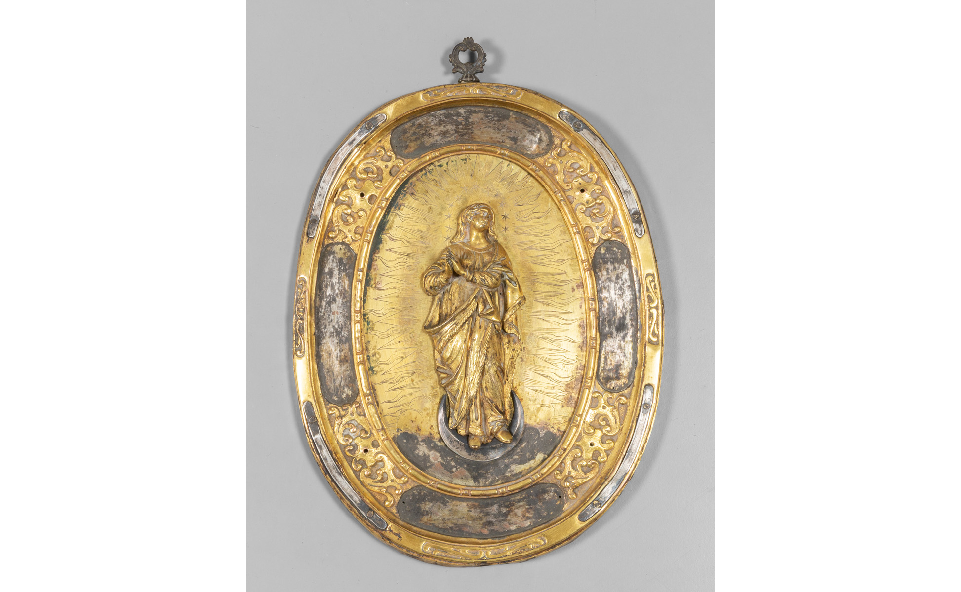 Madonnina in bronzo dorato montata su cornicetta di forma ovale in rame dorato sec.XVIII