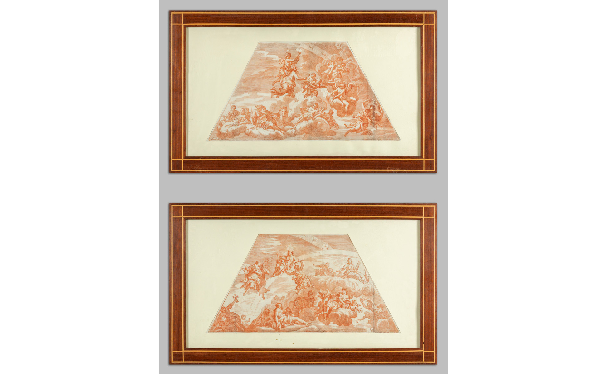 L.Baldi incisore George Szymon 'Scene mitologiche' coppia di incisioni a sanguigna di forma trapezoidale