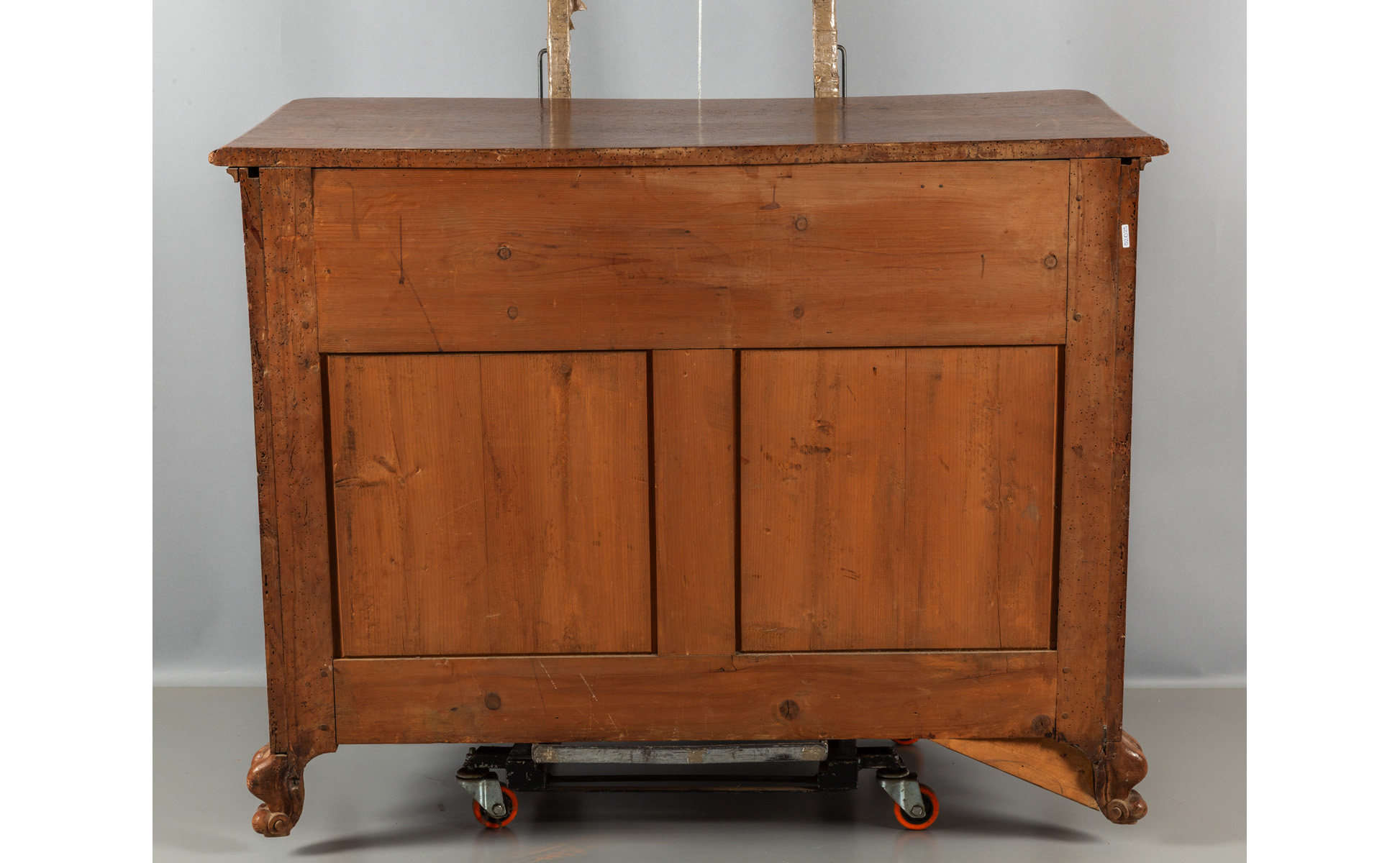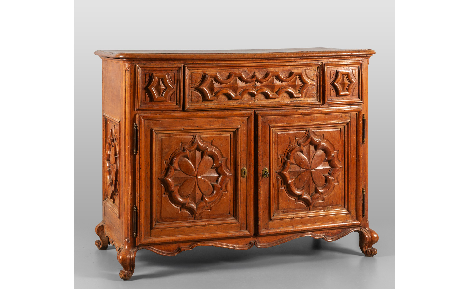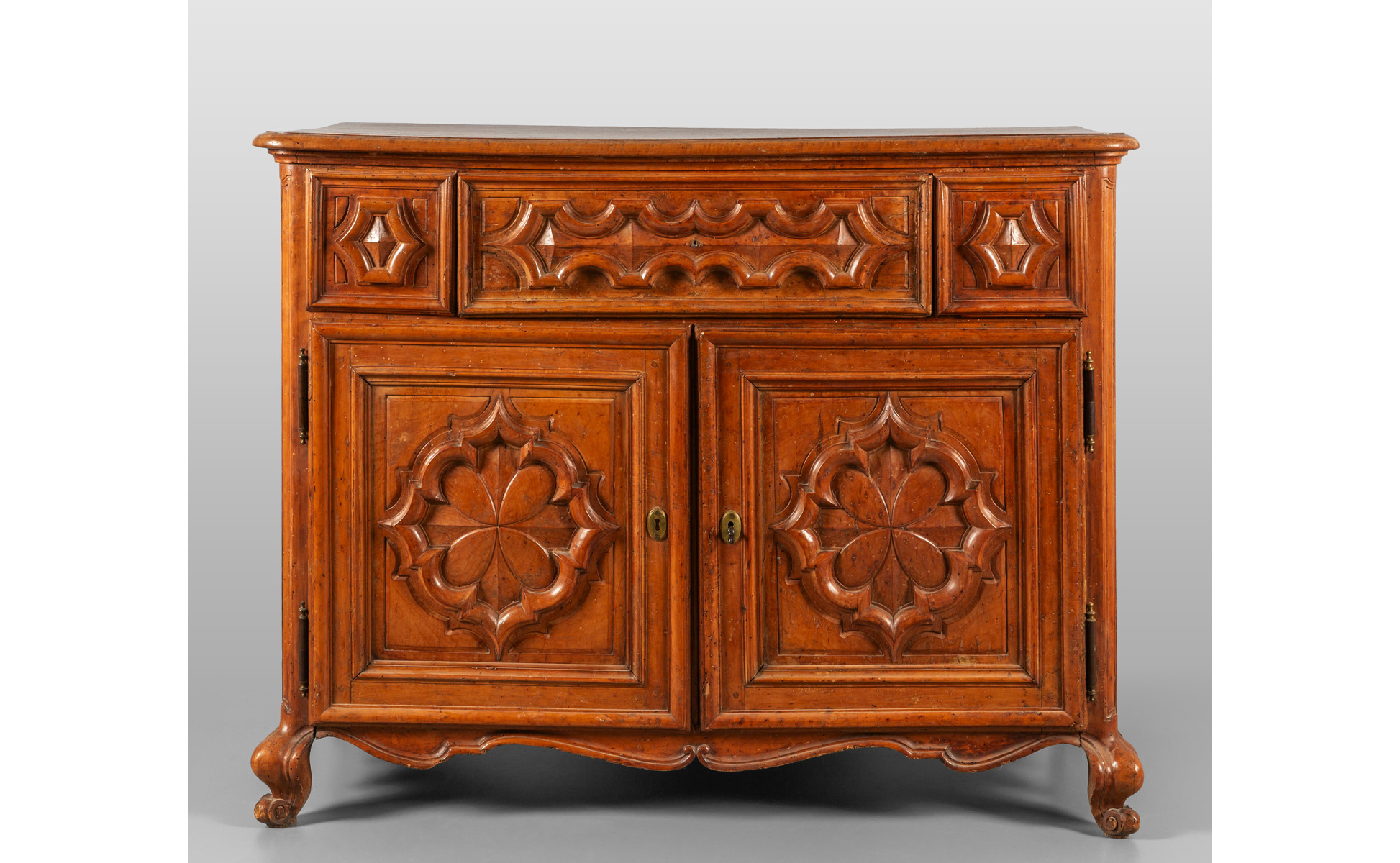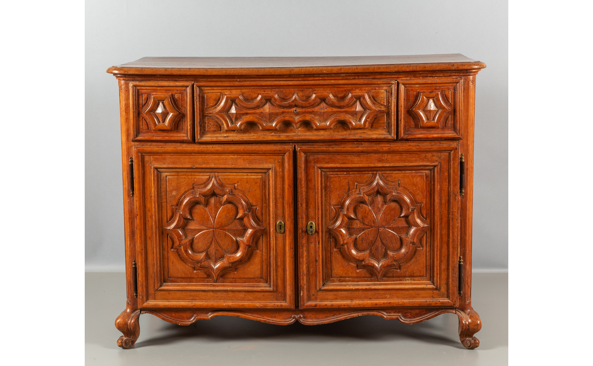 Credenza Luigi XIV in noce a tre cassetti e due sportelli fronte intagliato a motivi barocchi Piemonte sec.XVIII