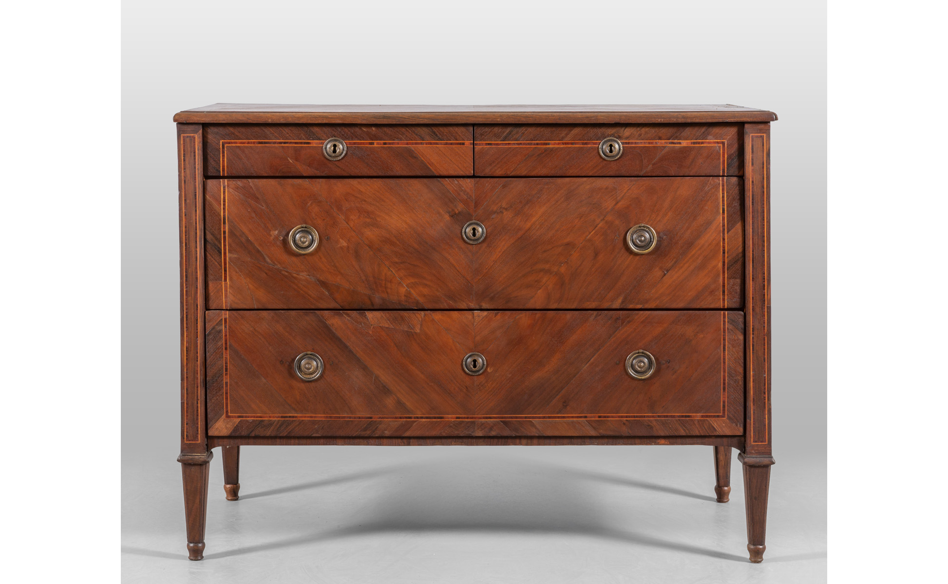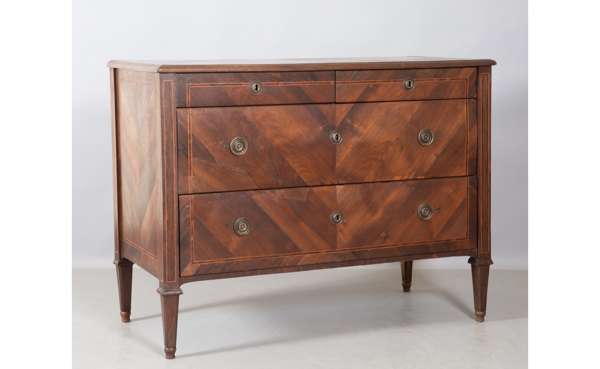 Comò Luigi XVI a due cassetti più due lastronato ed intarsiato anche sul piano in palissandro e legno di rosa Genova fine sec.XVIII