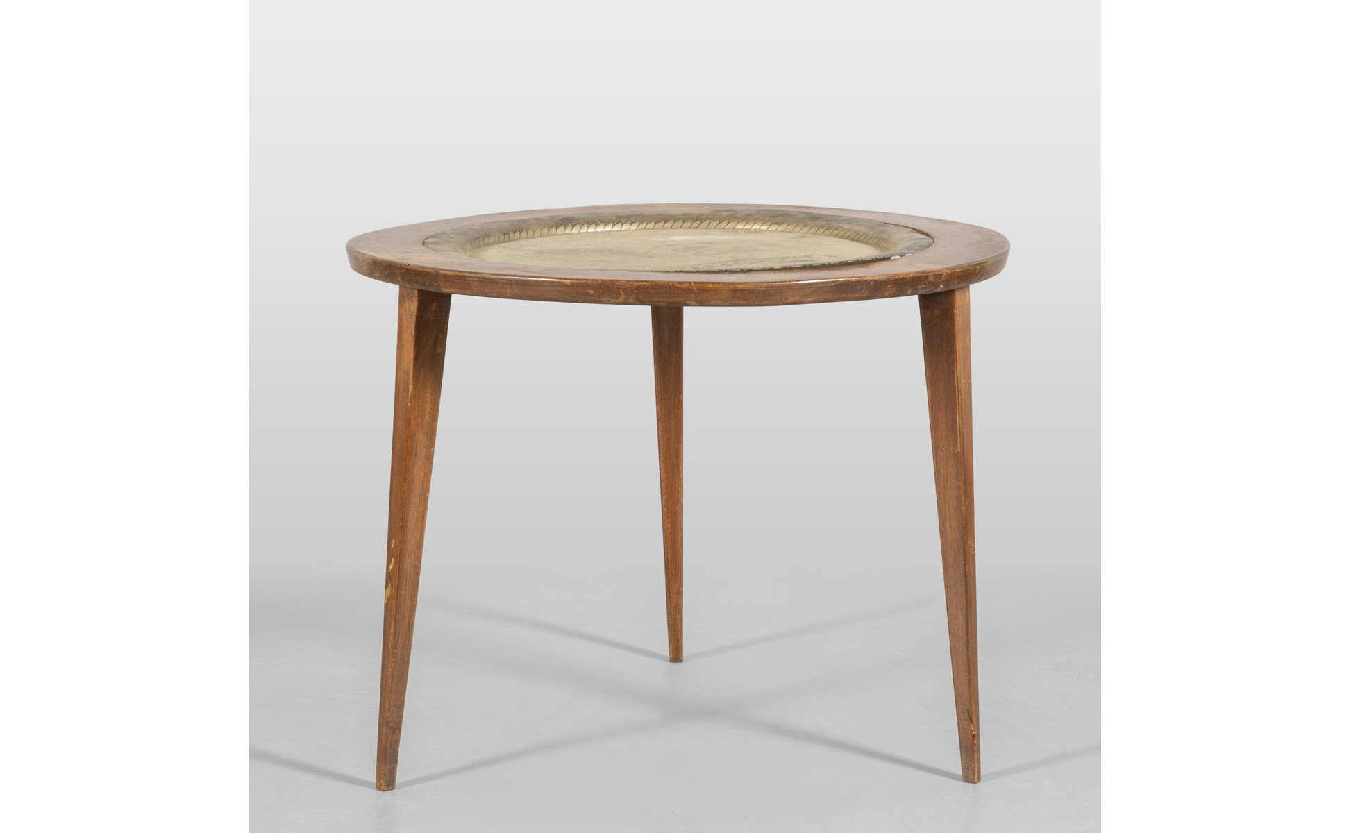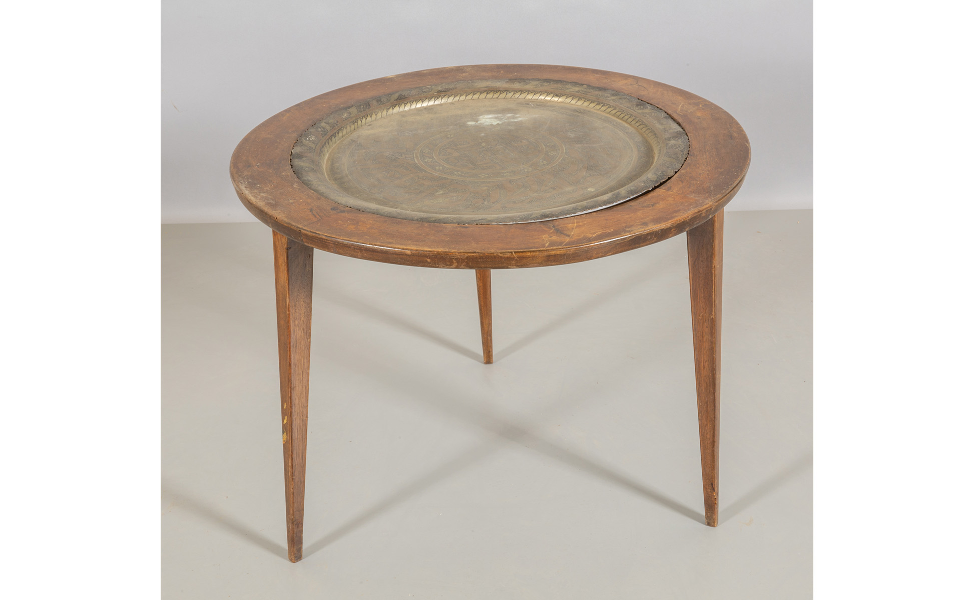 Tavolino a vassoio inciso a caratteri arabi con supporto in legno