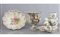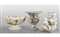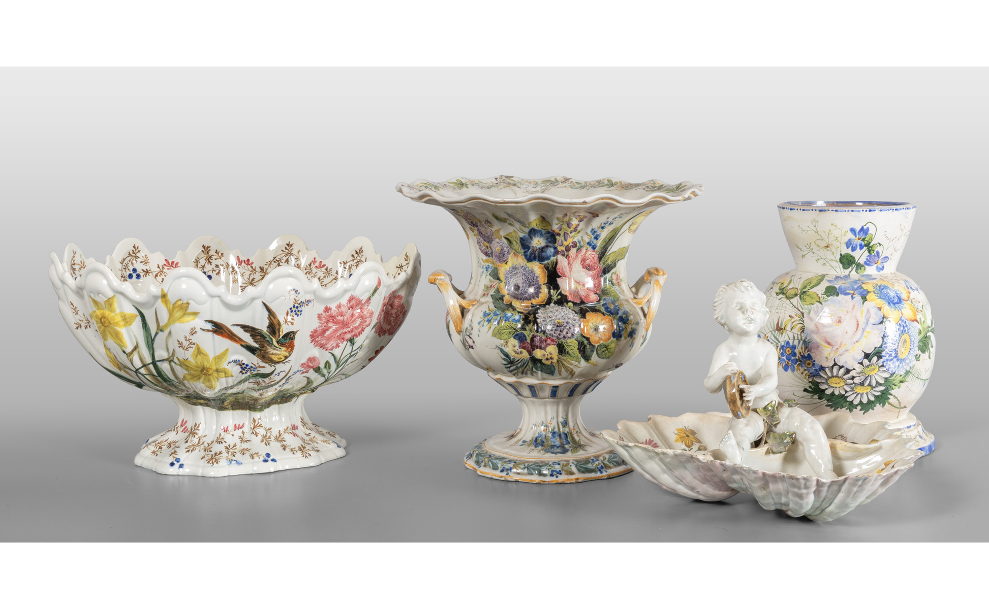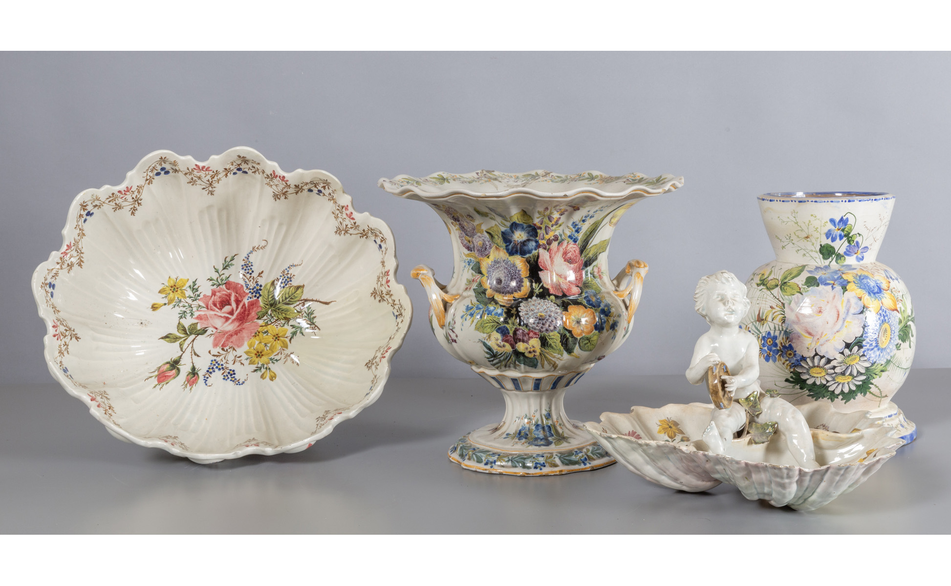 Grande vaso a due manici e una grande coppa con bordi smerlati centrotavola con putto e vaso in ceramica di Bassano decorata a fiori in policromia (rotture)