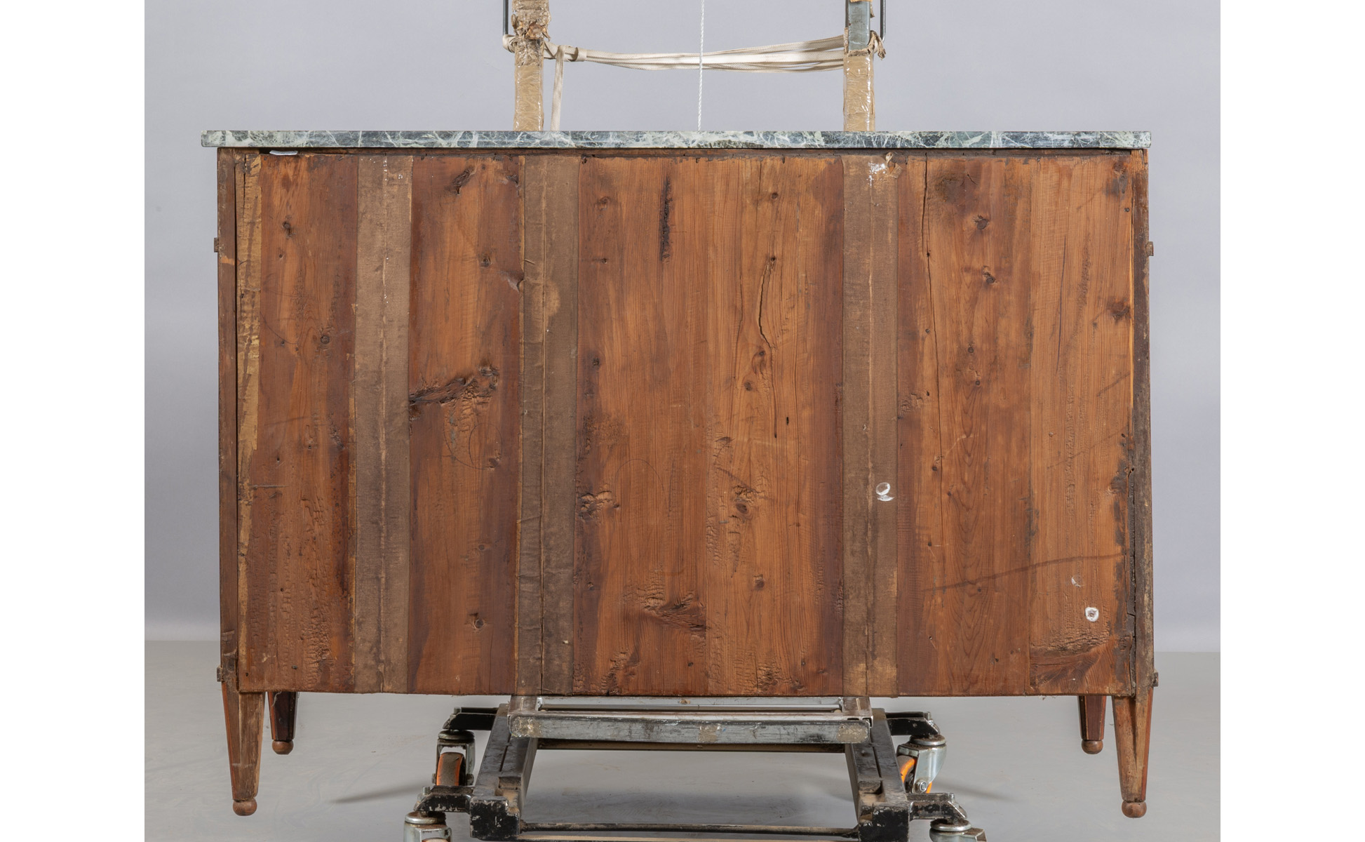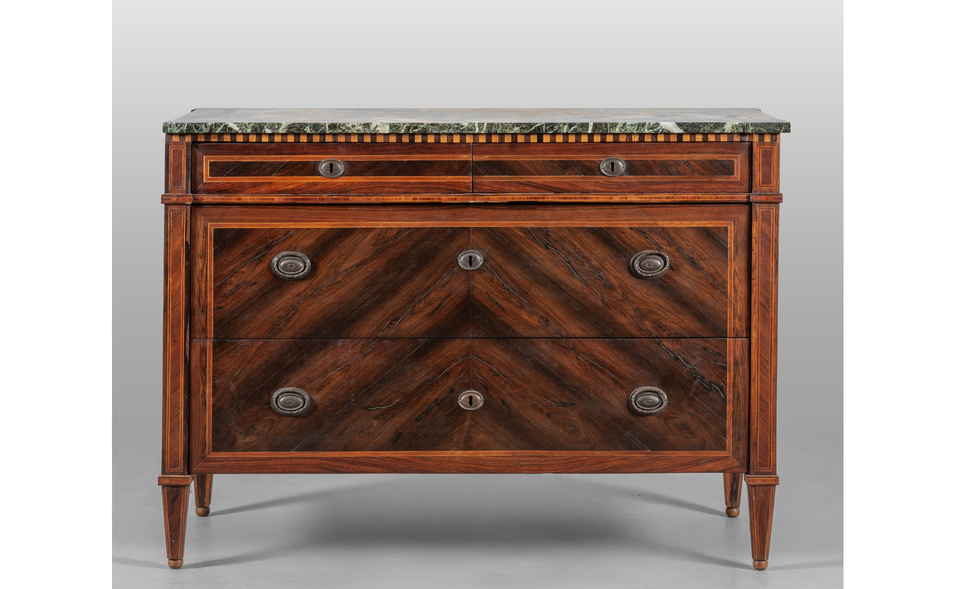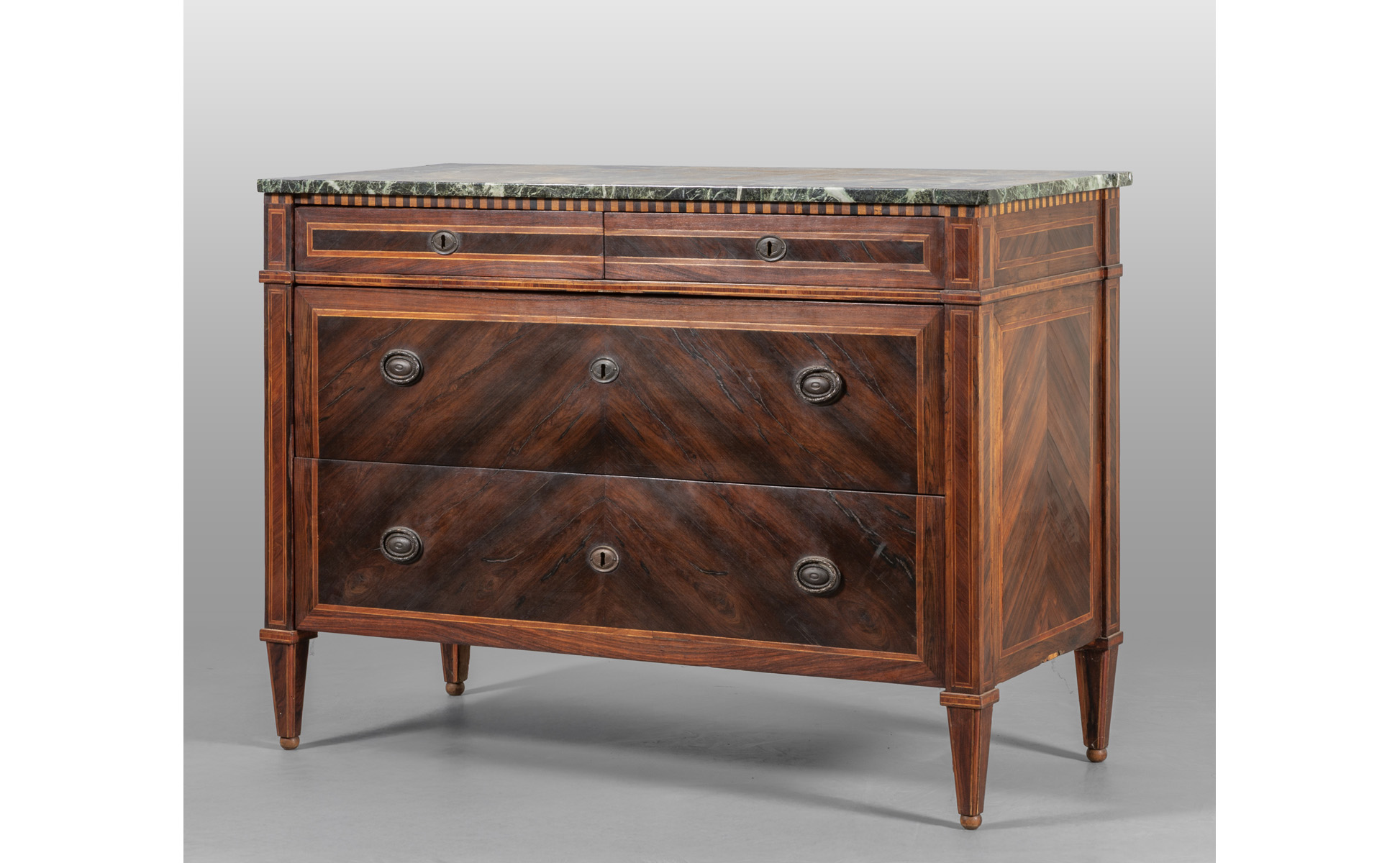 Comò Luigi XVI a due cassetti più due lastronato in palissandro e filettato in legni di frutto piano in marmo verde Alpi Genova fine sec.XVIII
