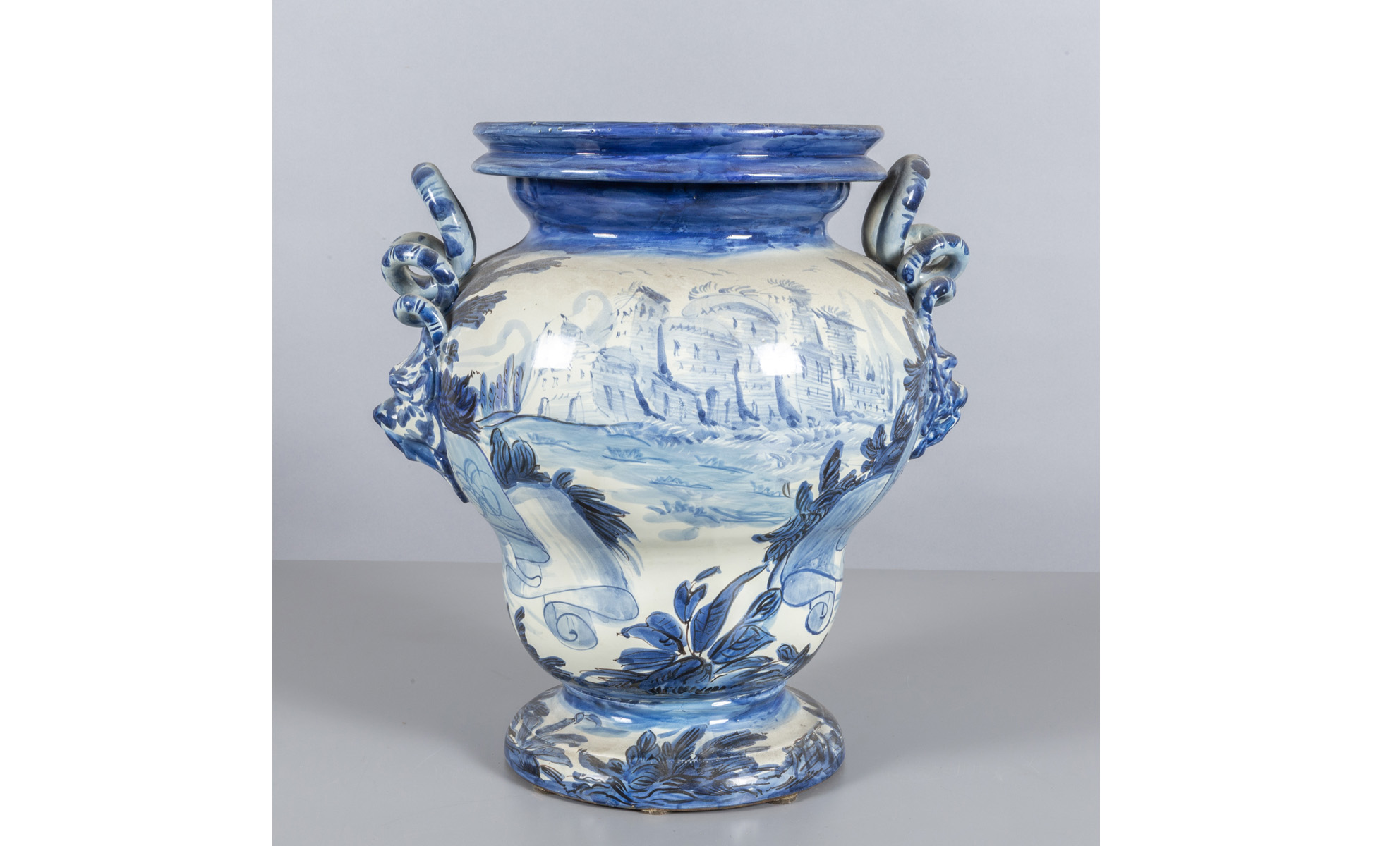Grande idria in ceramica decorazione con figurine bianche e blu su fondo bianco scritta medicinale AQUA DE PLANTAGINI Savona sec.XVIII