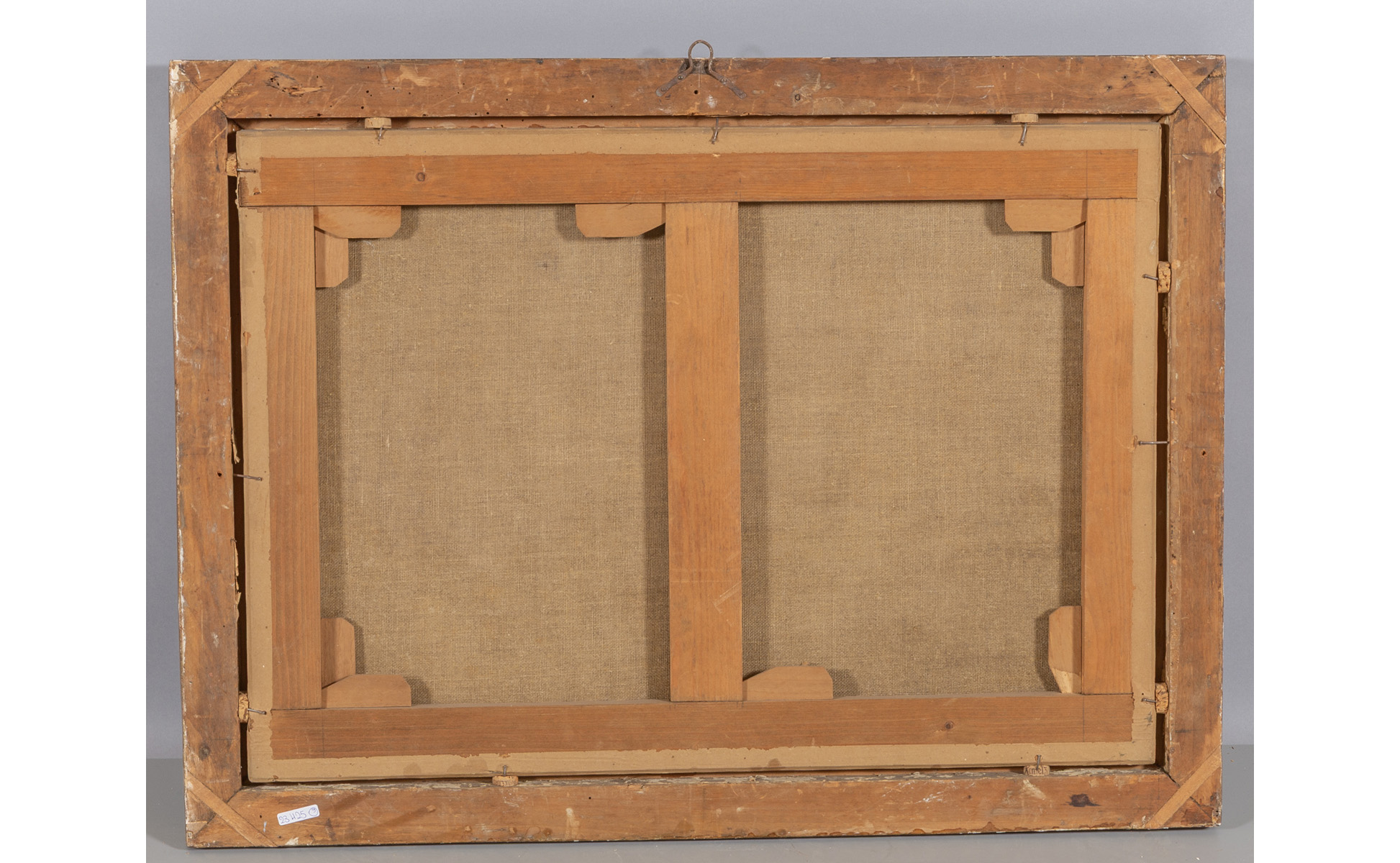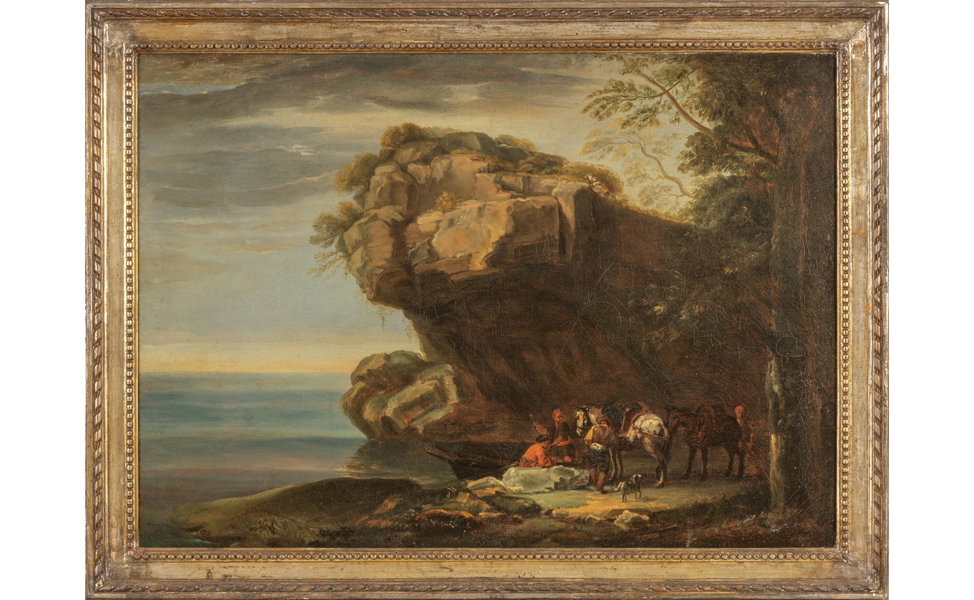 Scuola romana sec.XVIII 'Paesaggio roccioso animato con figure e cavalieri' olio cornice coeva in legno finemeneìte intagliato e dorato