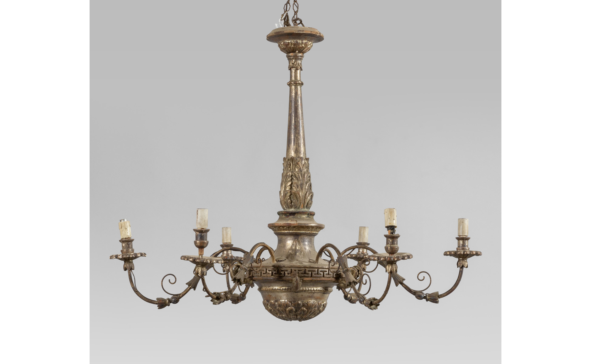 Lampadario Luigi XVI a sei luci in legno intagliato e meccato Italia Meridionale II metà sec.XVIII