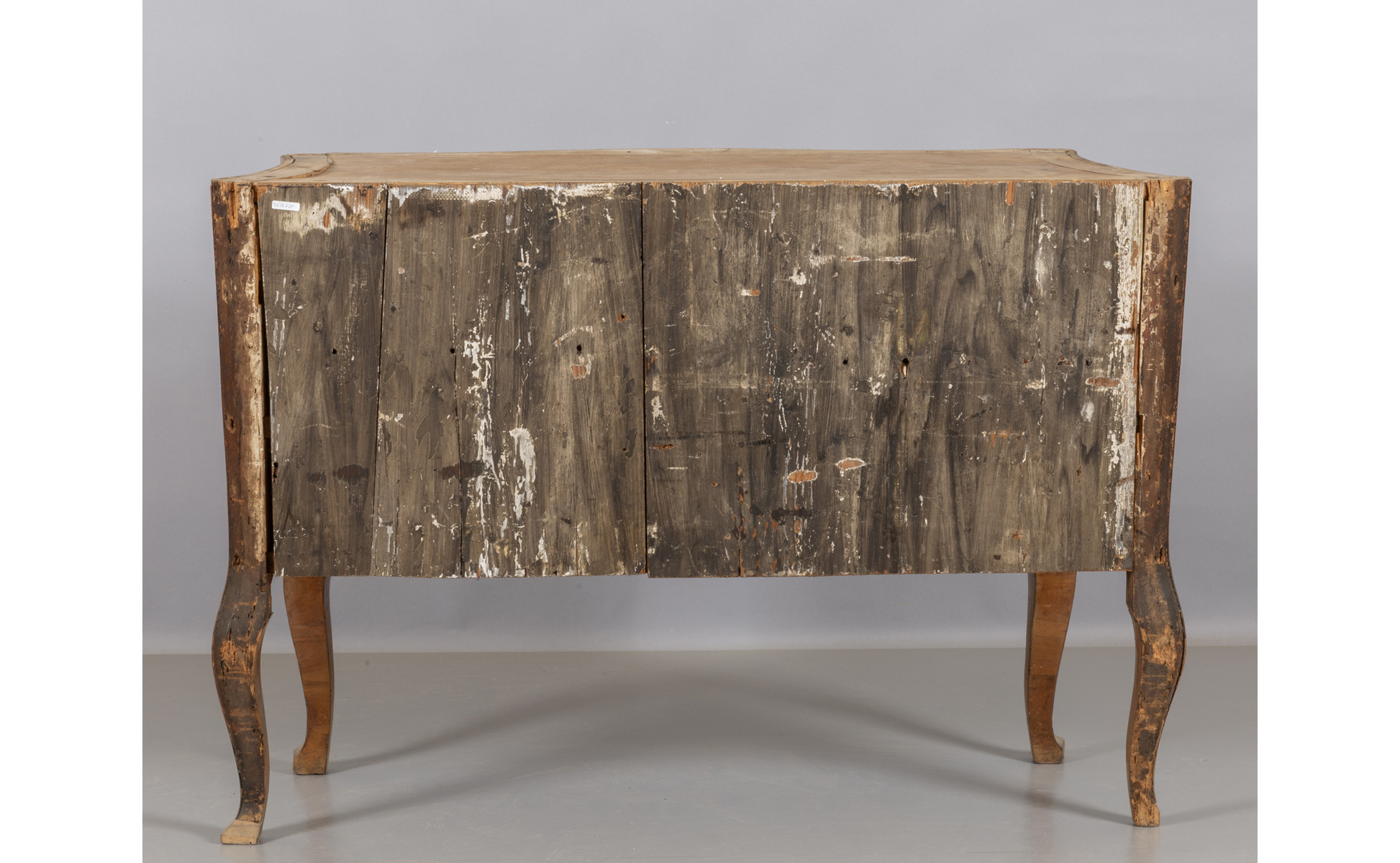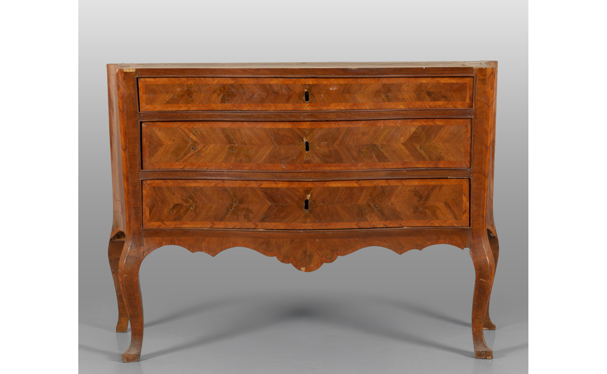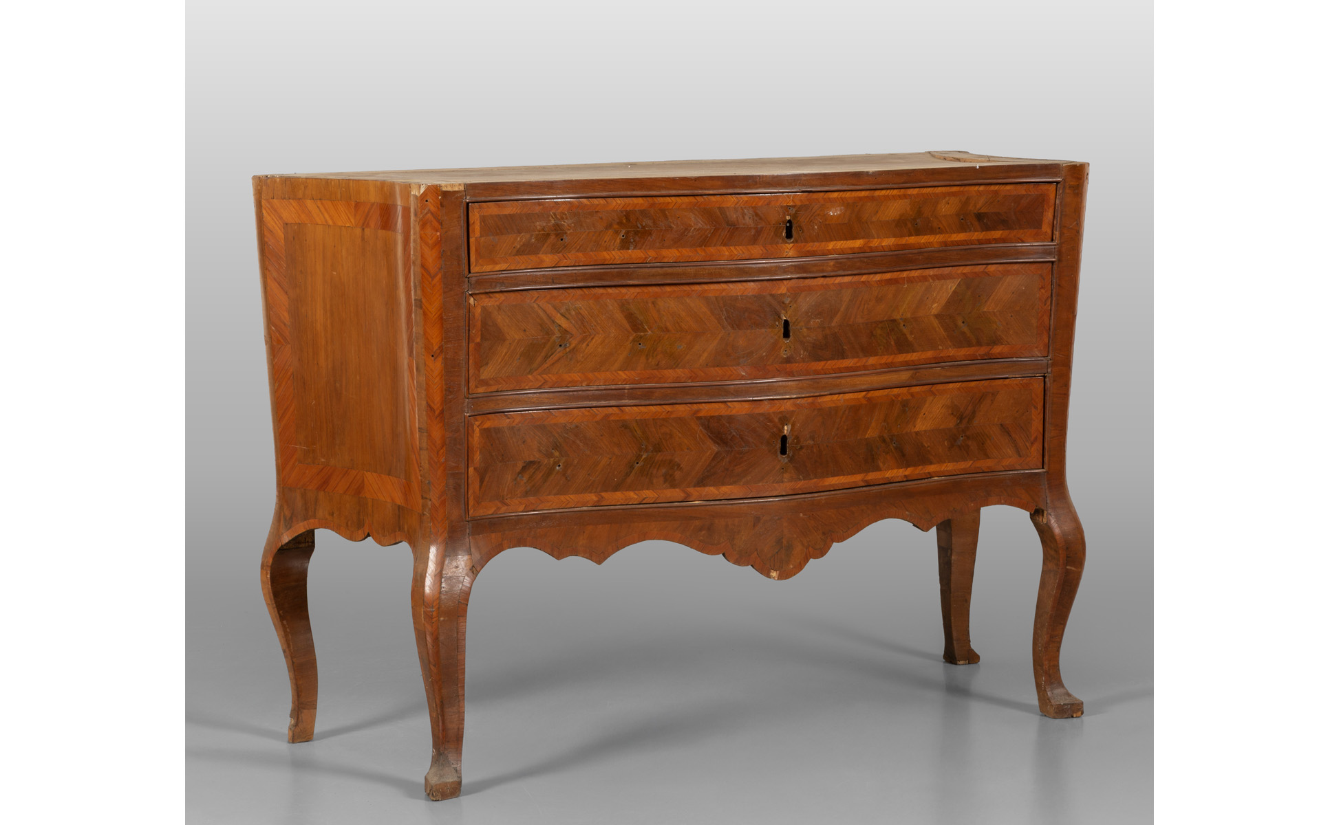 Comò Luigi XV a balestra movimetato sul fronte e sui fianchi lastronato in bois de rose tre cassetti Toscana sec.XVIII