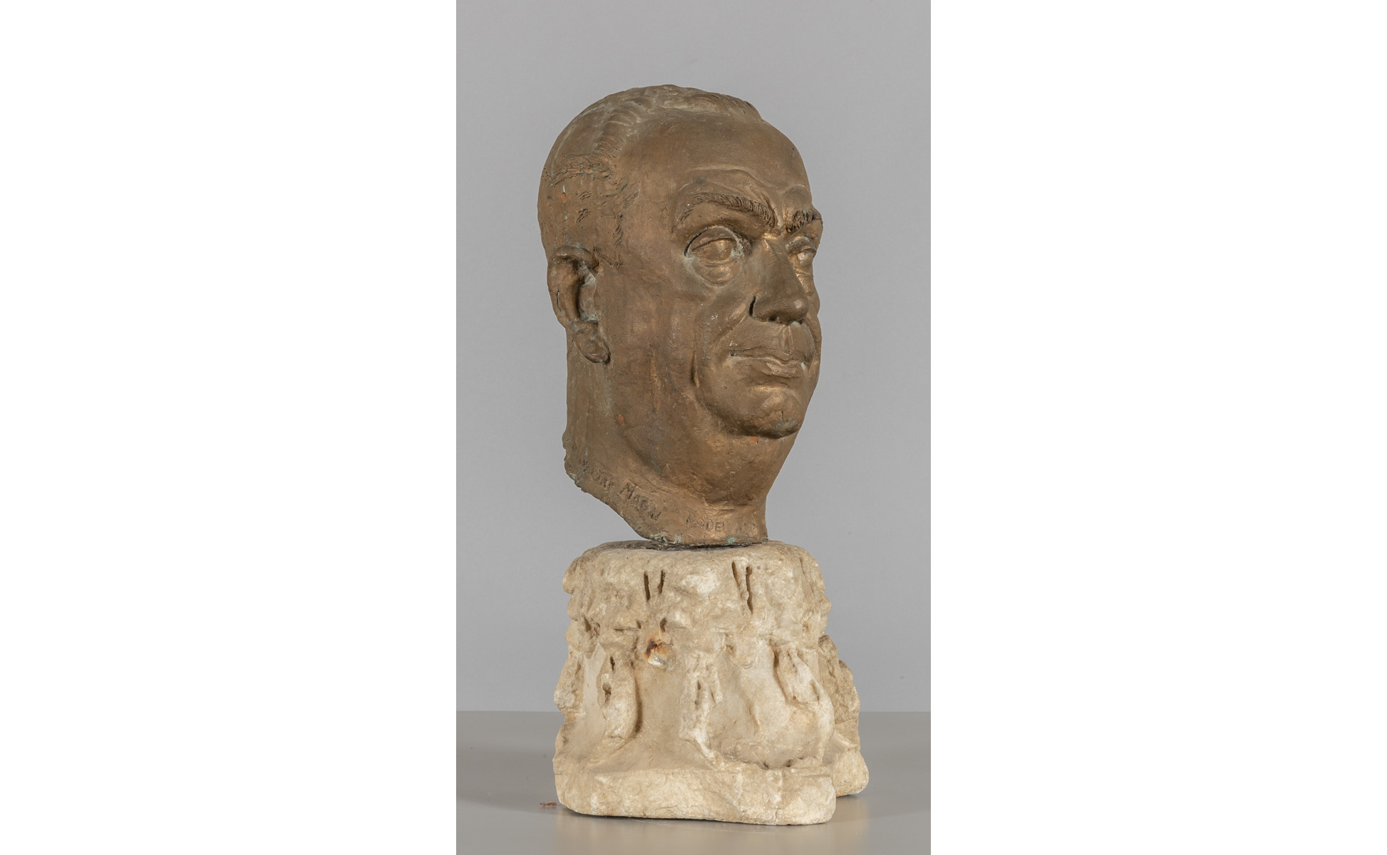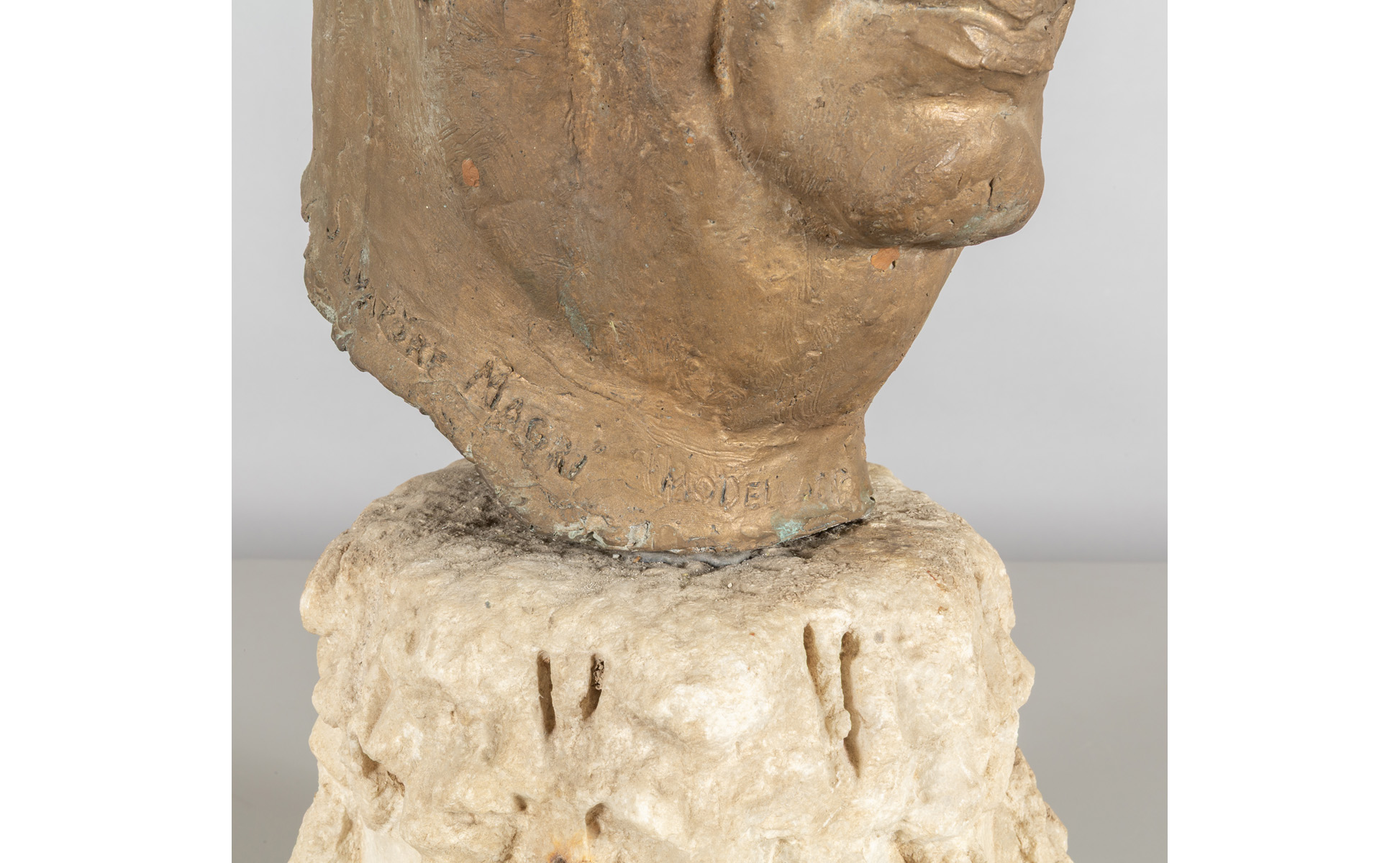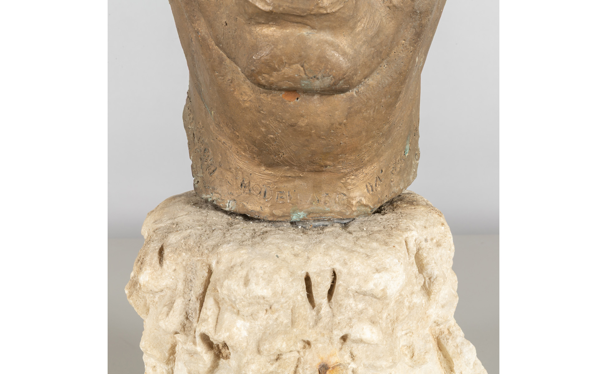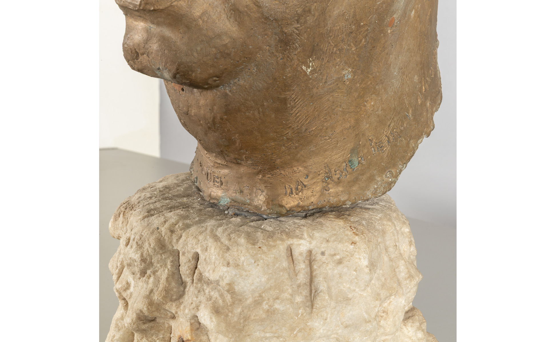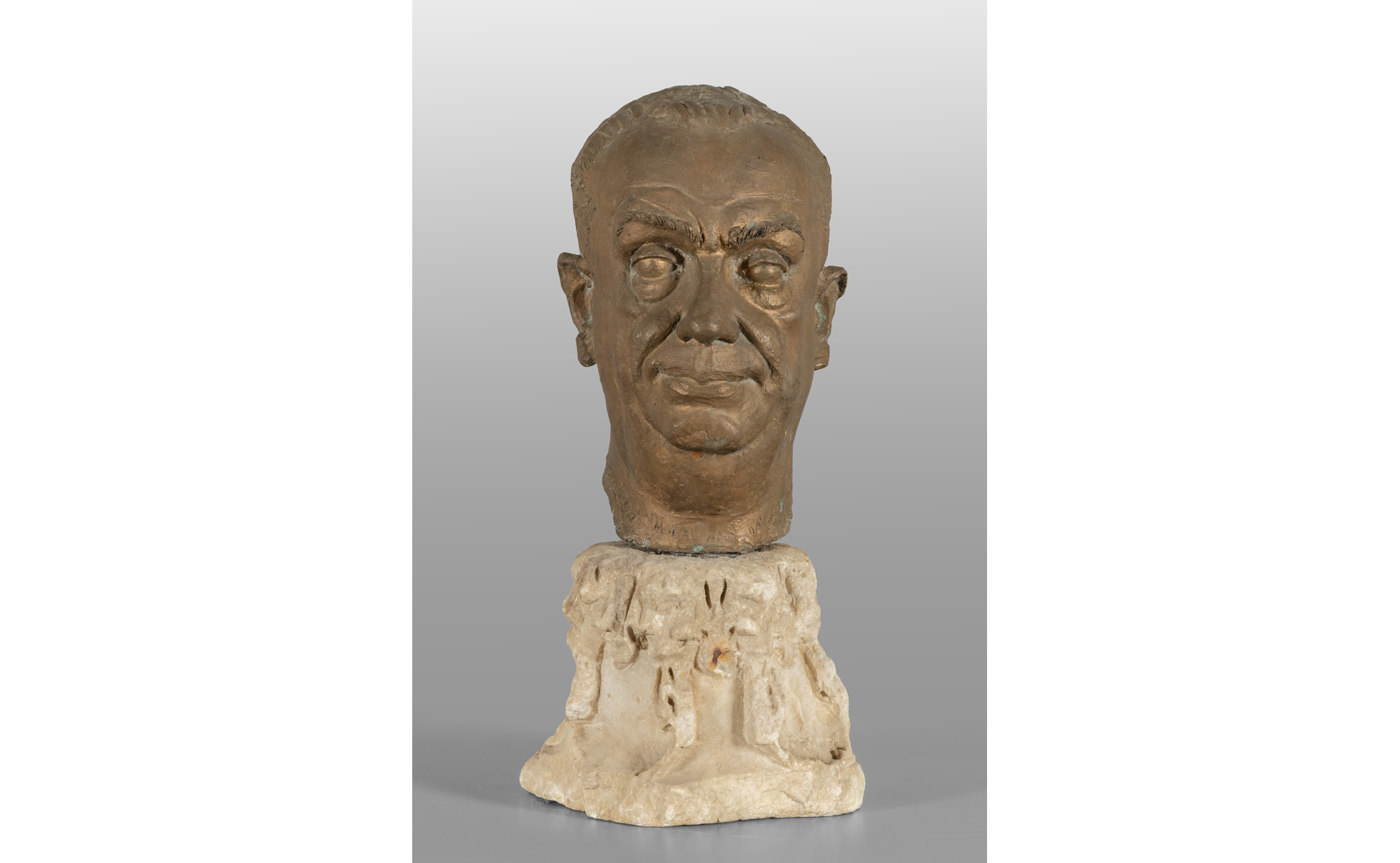 Testa virile in bronzo poggiante su antico capitello in marmo