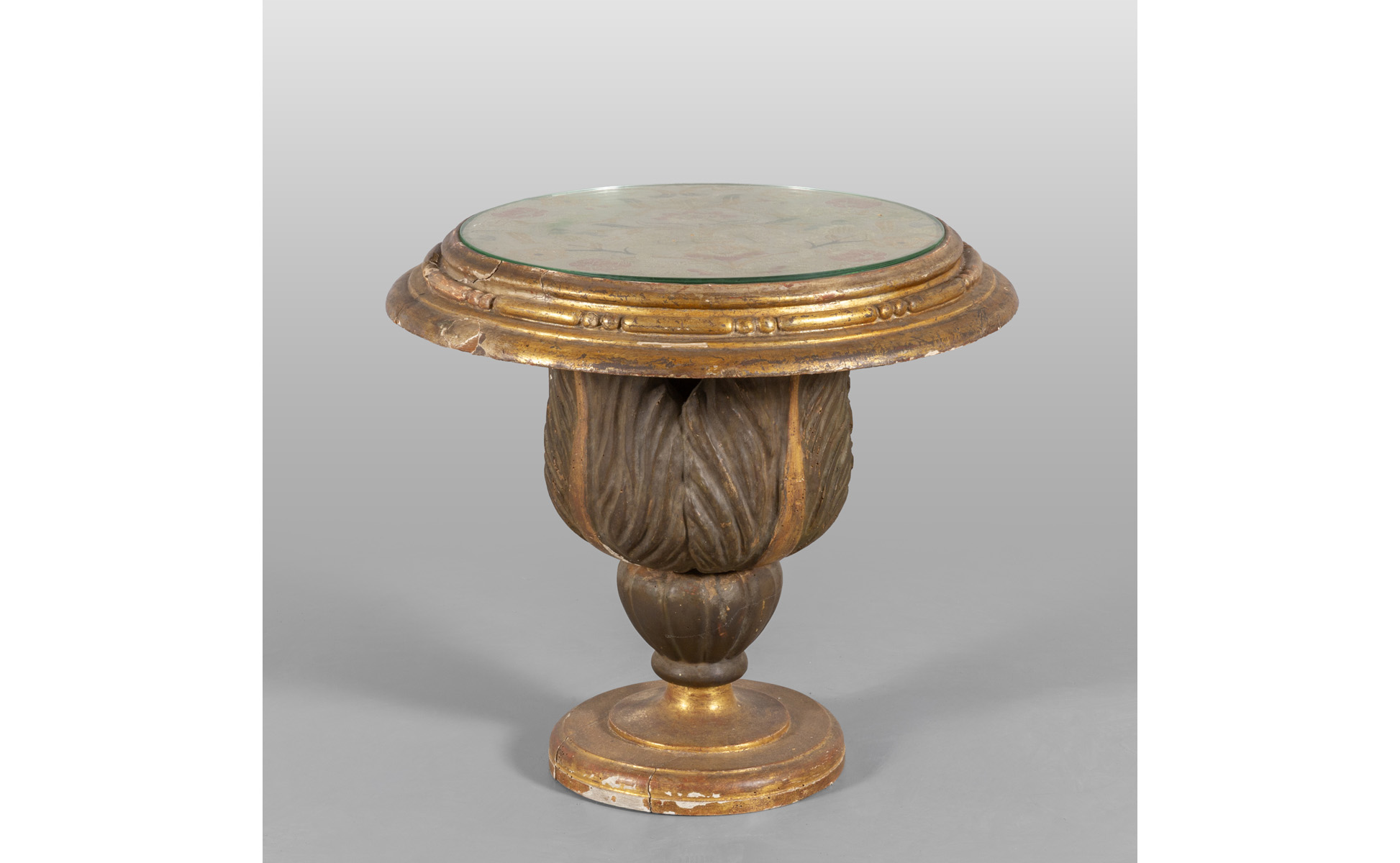 Tavolino da appoggio di forma rotonda su base a forma di vaso dorato in policromia nel piano ricamo sec.XVIII