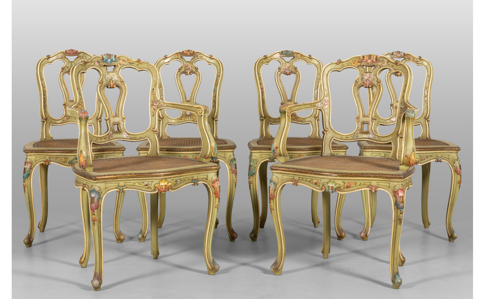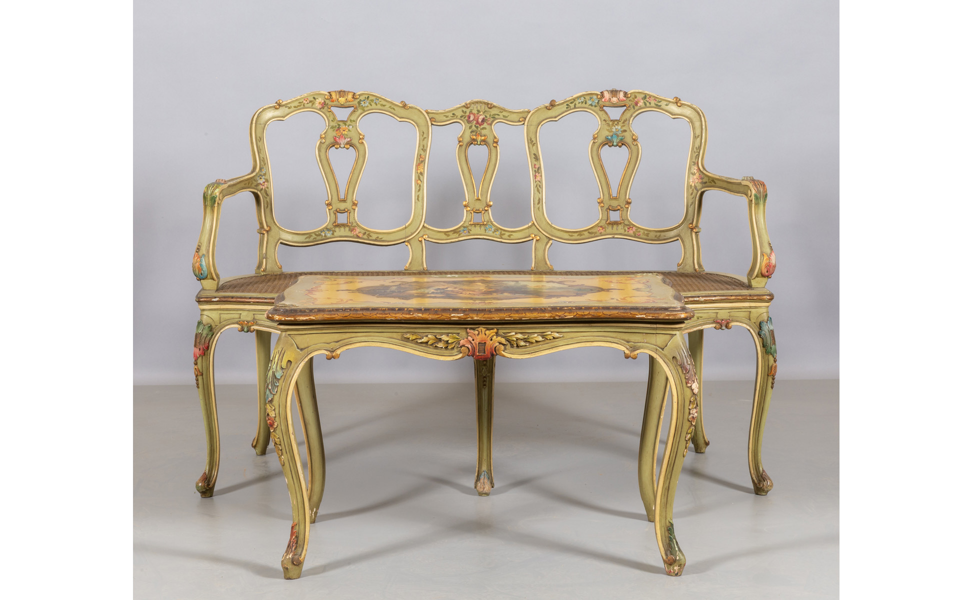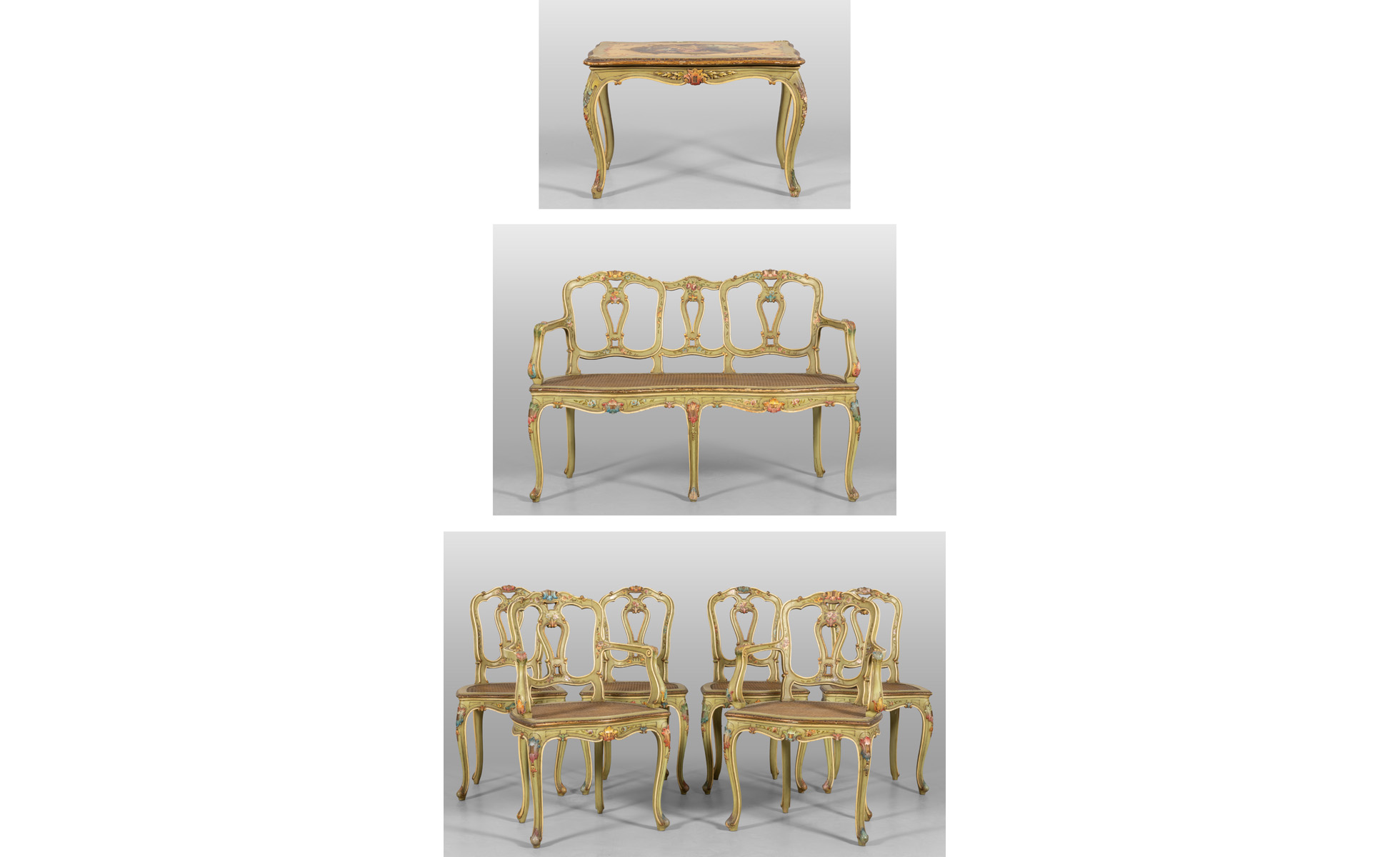 Salotto in legno laccato a motivi floreali composto da un divano due poltrone quattro sedie e un tavolino inizi sec.XX