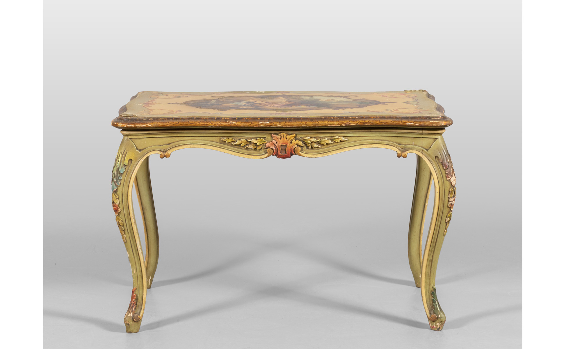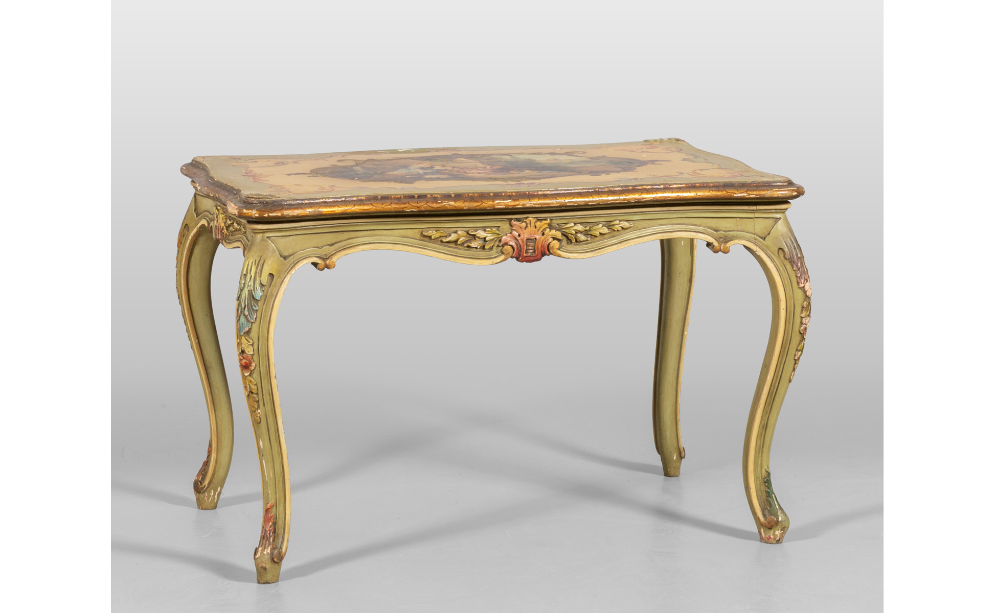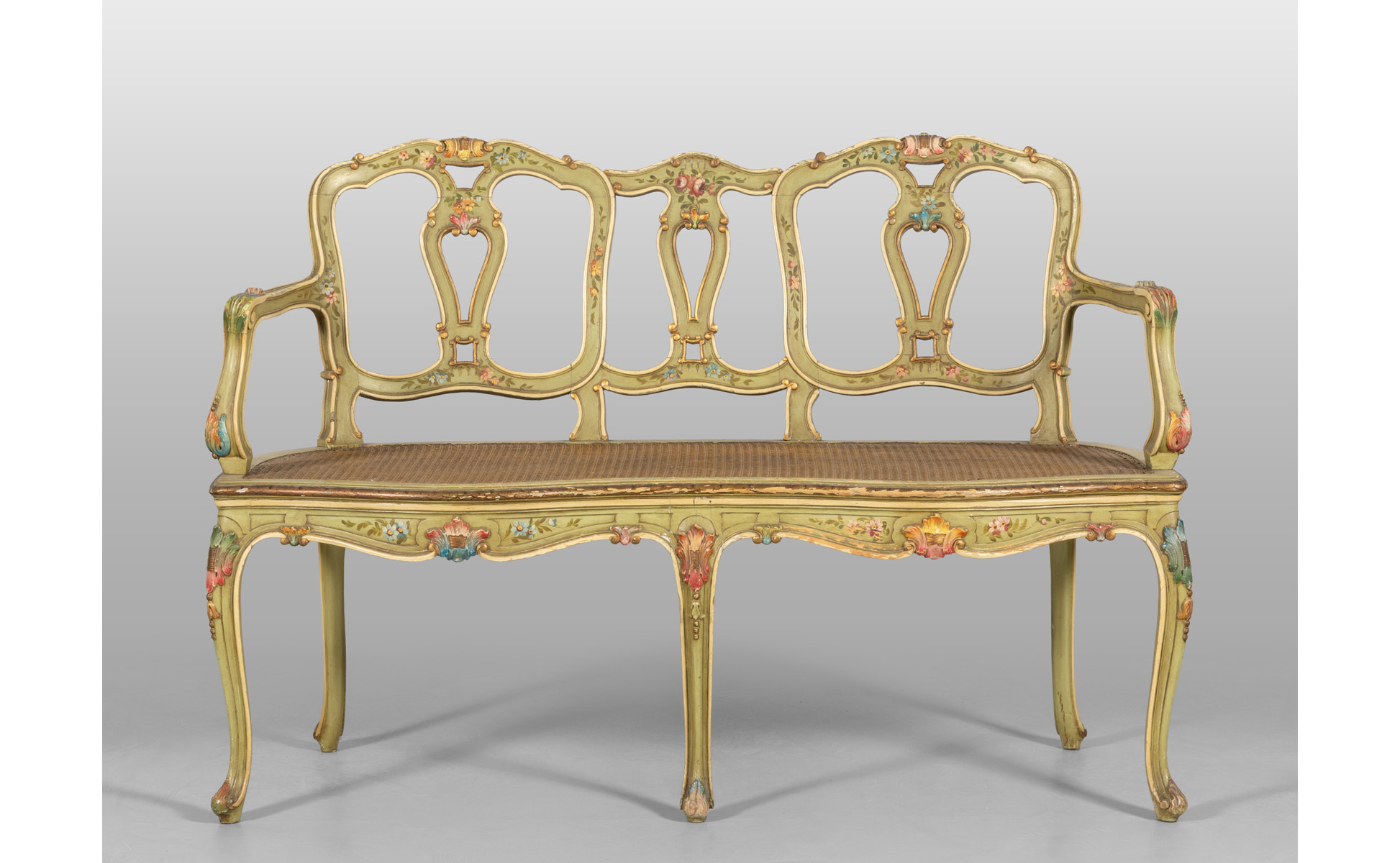 Salotto in legno laccato a motivi floreali composto da un divano due poltrone quattro sedie e un tavolino inizi sec.XX