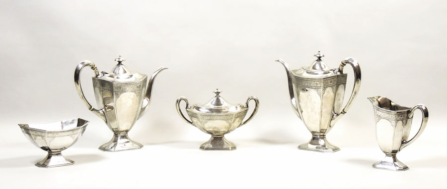 SERVITO DA TE E CAFFÈ IN ARGENTO STERLING realizzato in stile Impero, corpi sfaccettati con fascia cesellata con motivi floreali, composto da teiera, caffettiera, due zuccheriere, lattiera gr 1705 (5) STERLING SILVER TEA AND COFFEE SET