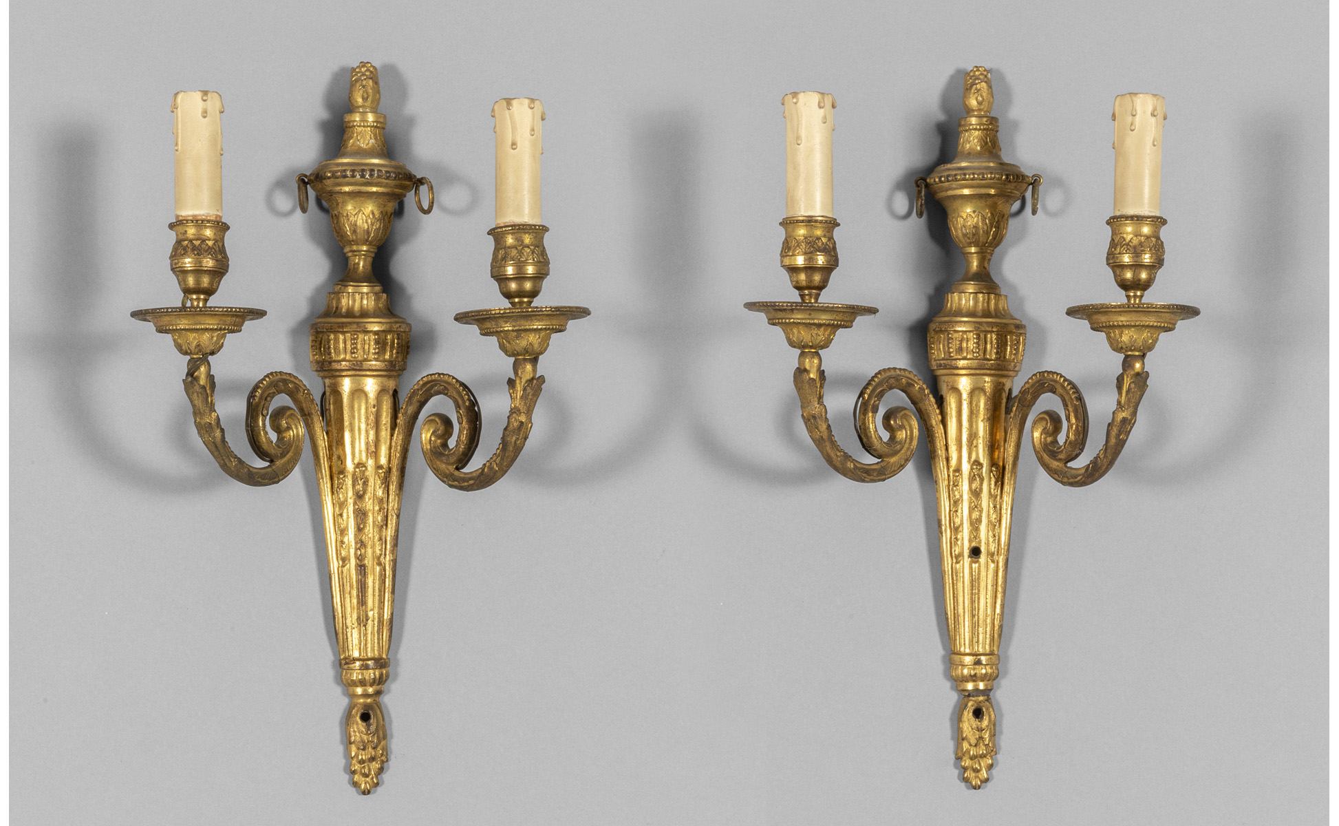 Coppia di apliques in stile Luigi XVI a due luci in bronzo dorato