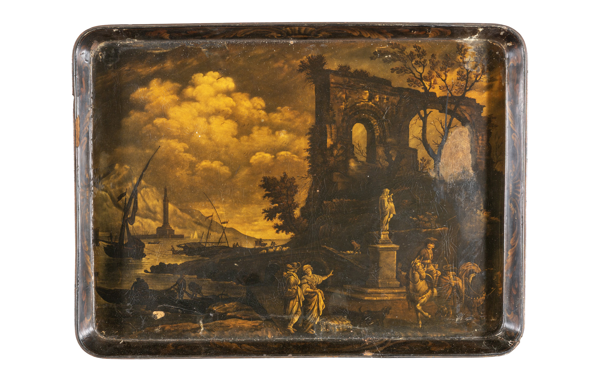 Vassoio in lacca dipinta raffigurante paesaggio marino animato da figure Francia sec.XIX