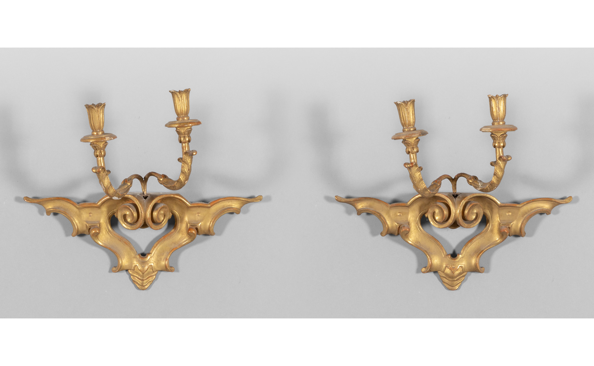 Coppia di mensole in legno finemente intagliato e dorato parte superiore con braccetti portaluce fine sec.XVIII