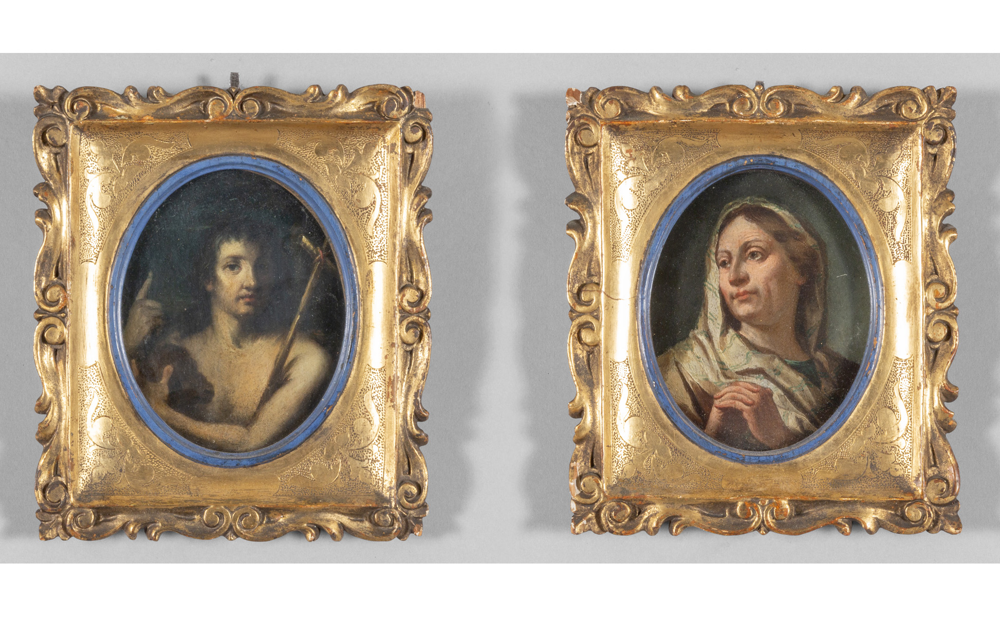 Scuola veneta sec.XVIII 'San Giovanni Battista' e 'Madonna orante' coppia di olii su tavola di forma ovale cornici in legno intagliato e dorato