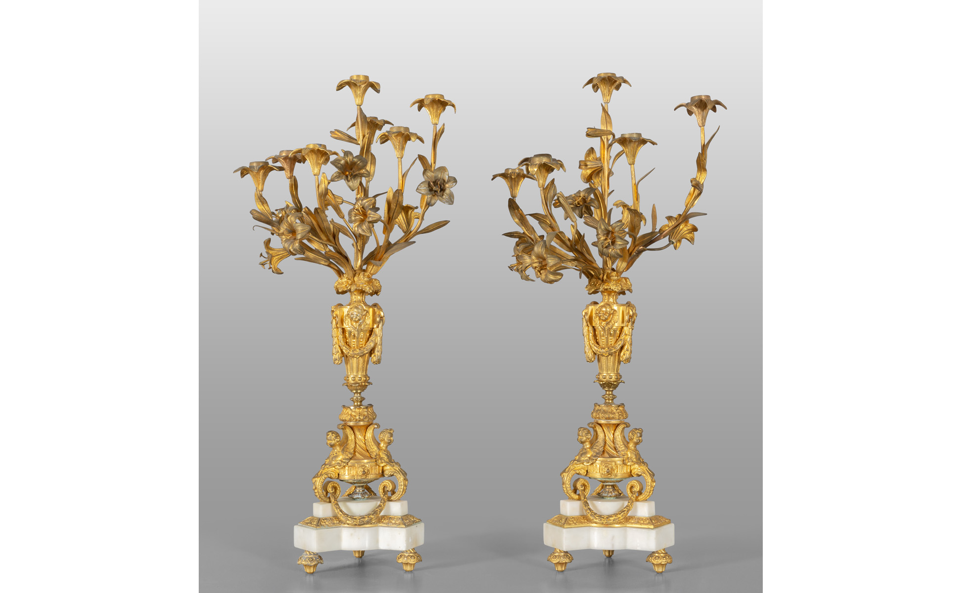 Coppia di candelabri in bronzo e marmo a sette luci