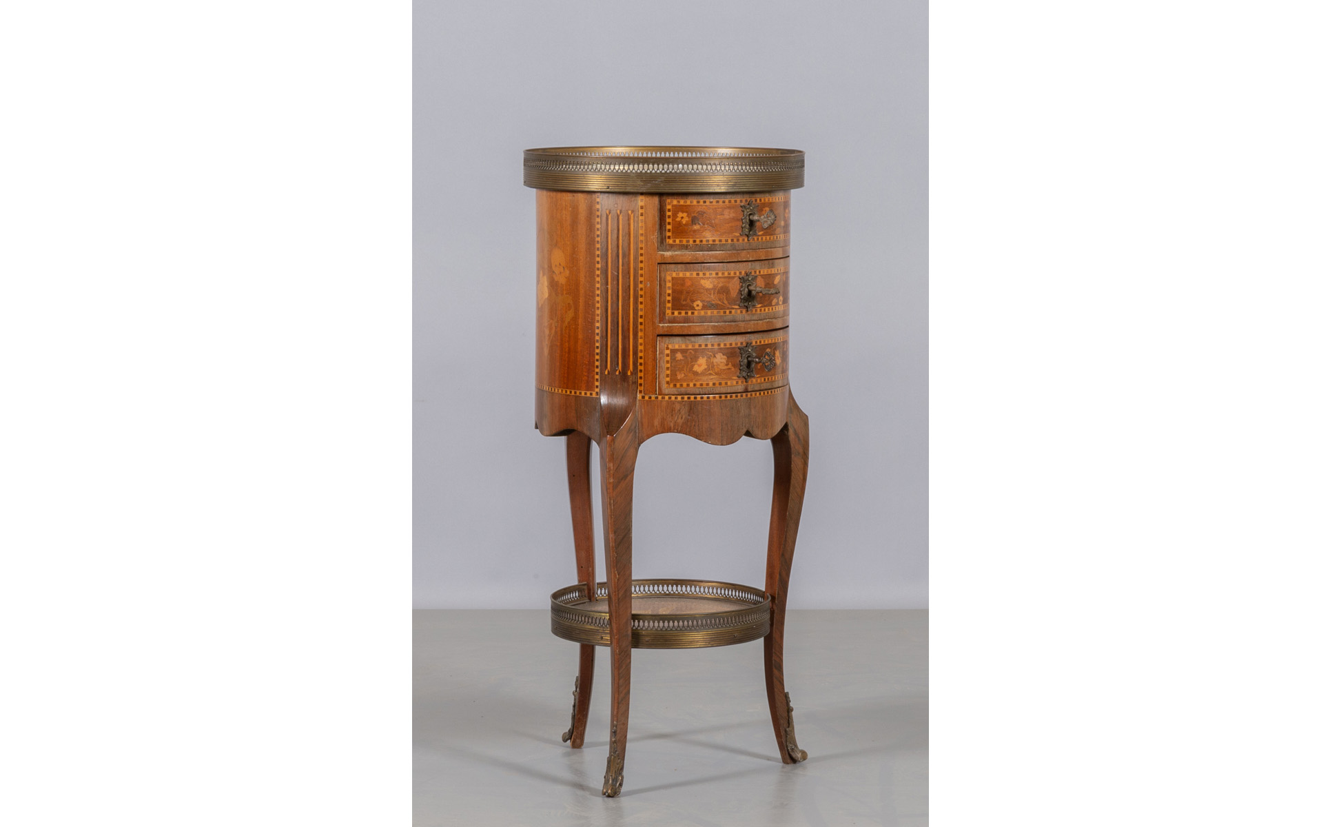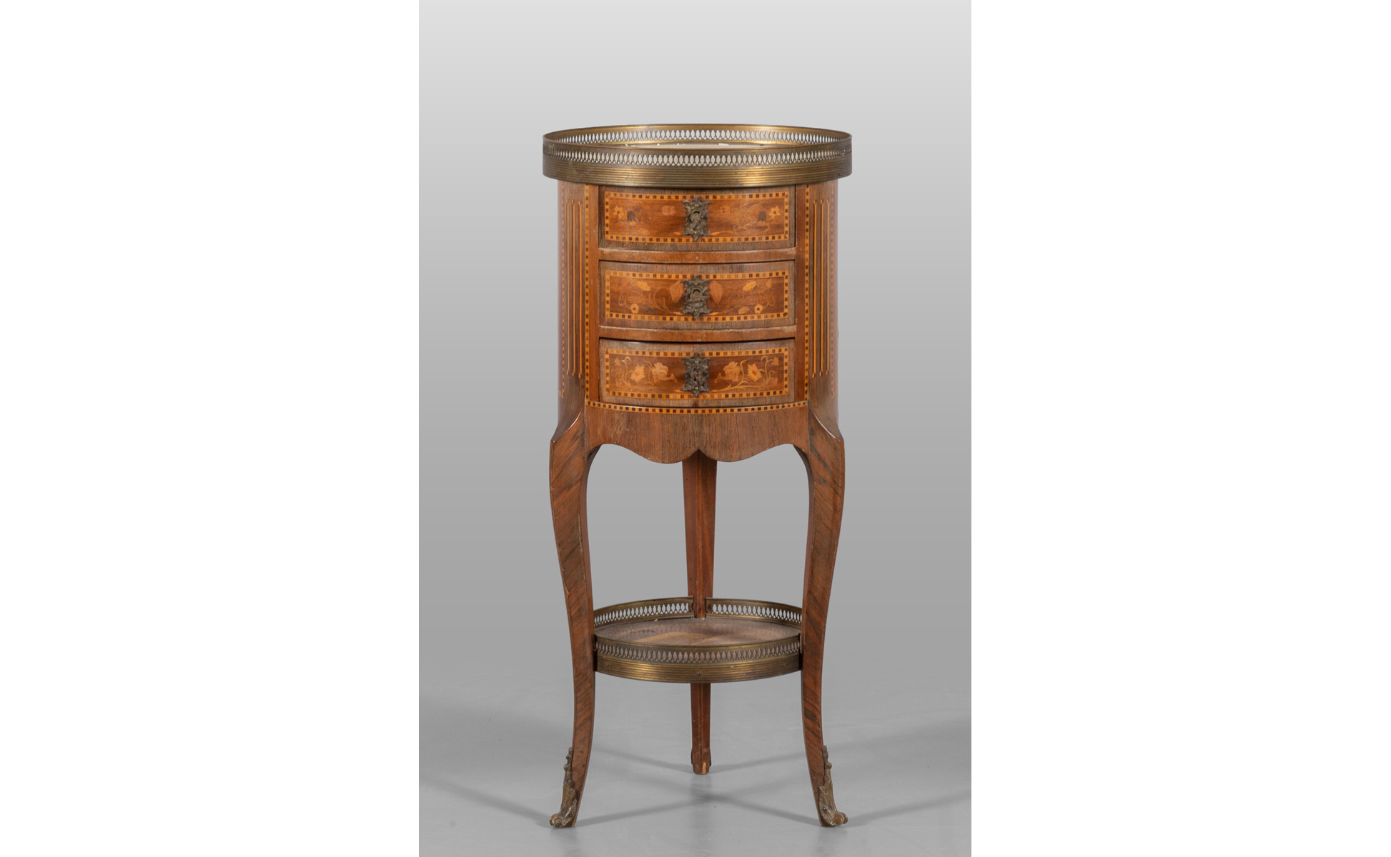 Comodino Napoleone III a cilindro tre cassetti nella fascia intarsiato a motivo di fiori Francia sec.XIX