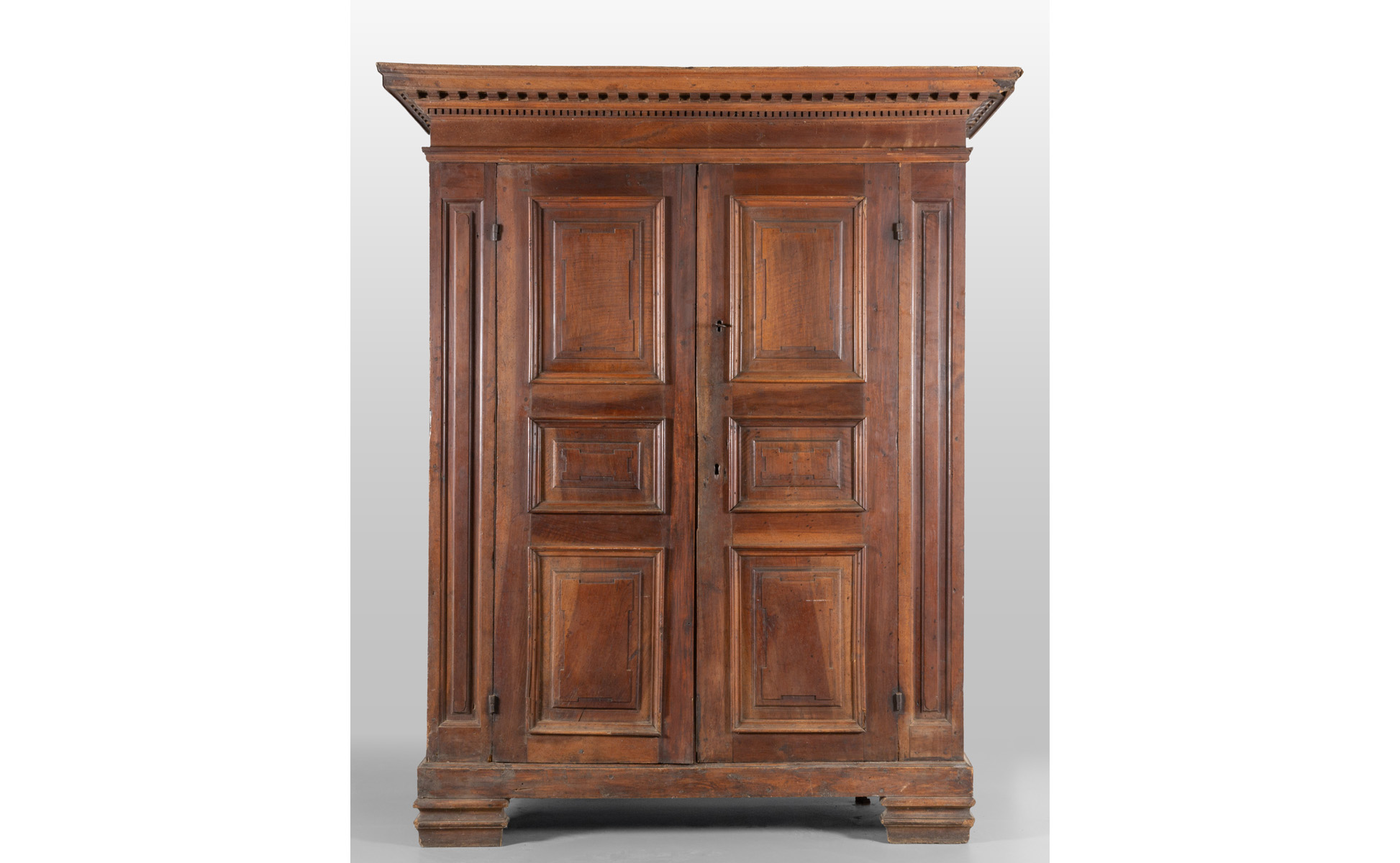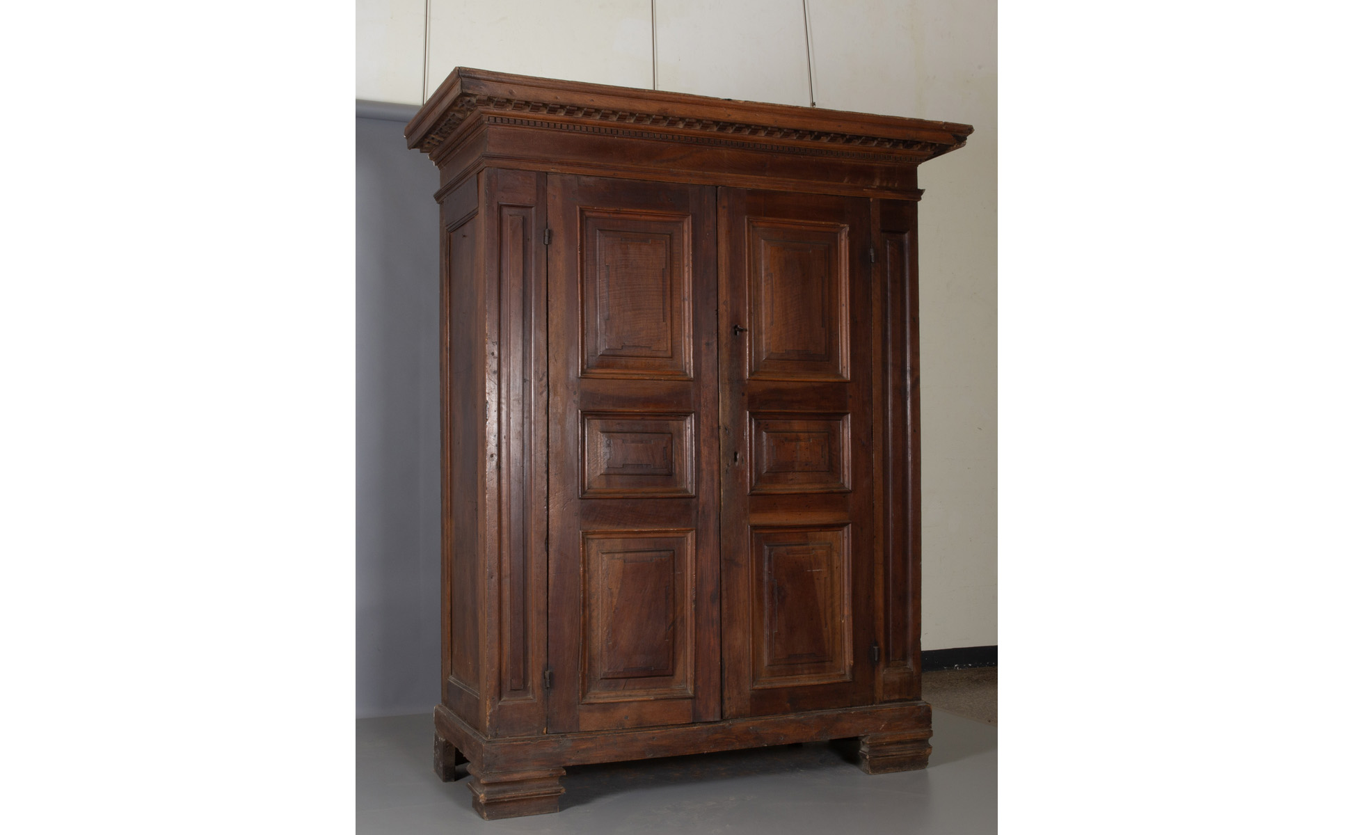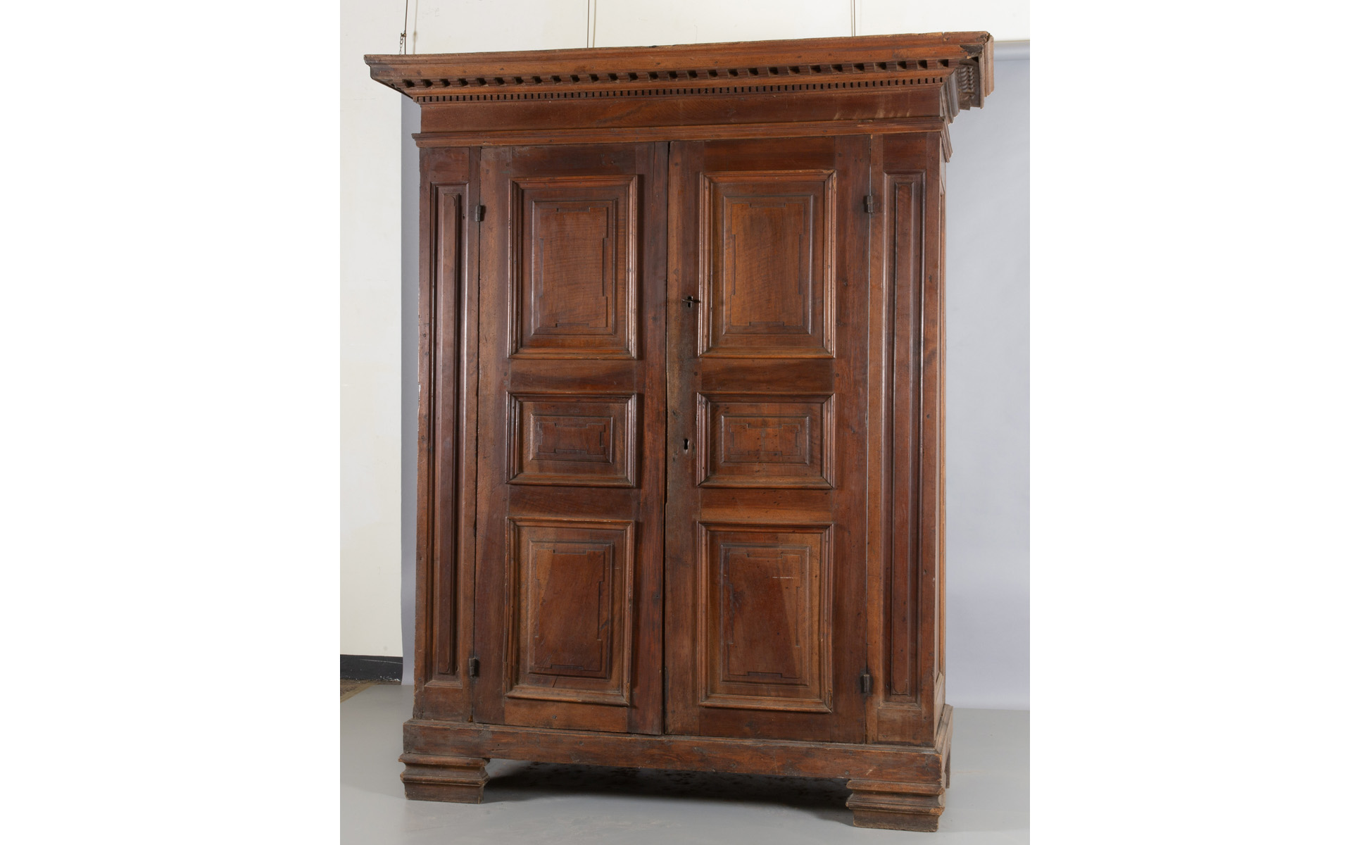 Armadio Luigi XIV in noce intagliato a due porte pannellate Lombardia inizi sec.XVIII