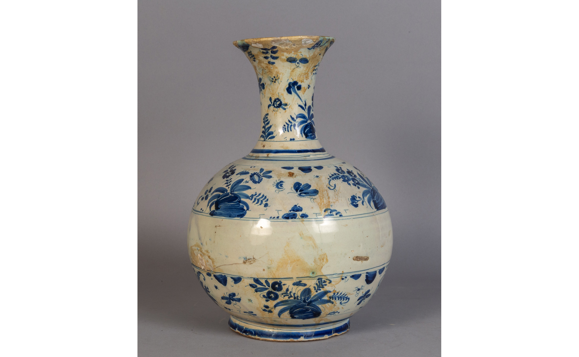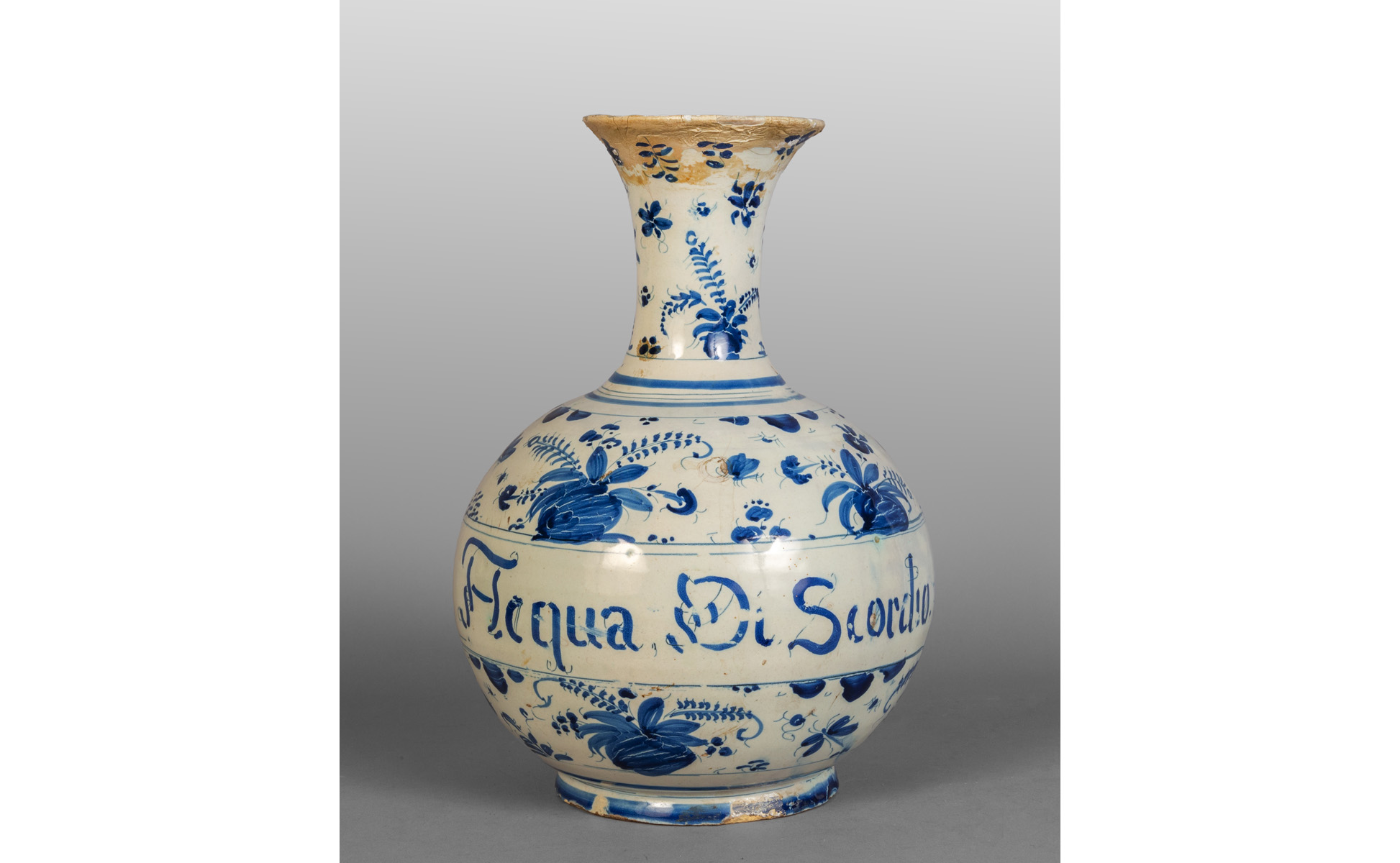 Bottiglia in ceramica a decorazione bianca e blu scritta medicinale 'Acqua di Scordo' Savona sec.XVIII