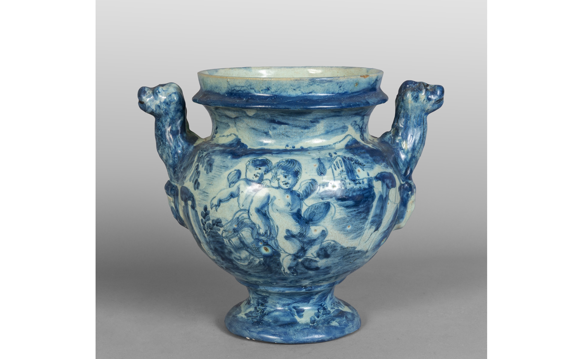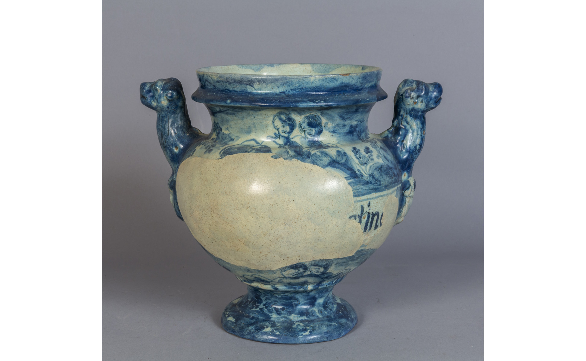 Vaso con manici in ceramica a decorazione bianca e blu marca Lanterna Savona sec.XVIII