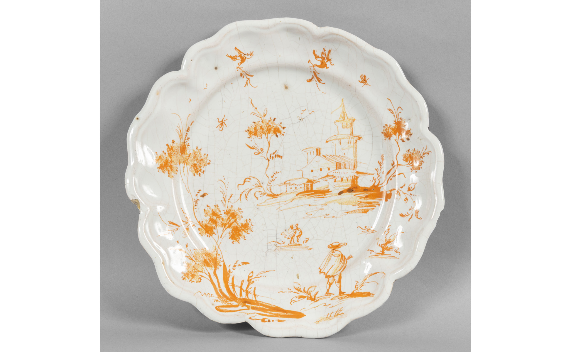Piatto in maiolica decorato in manganese su fondo bianco con figurette nel paesaggio marcato G.B. sul fondo Savona sec.XVIII