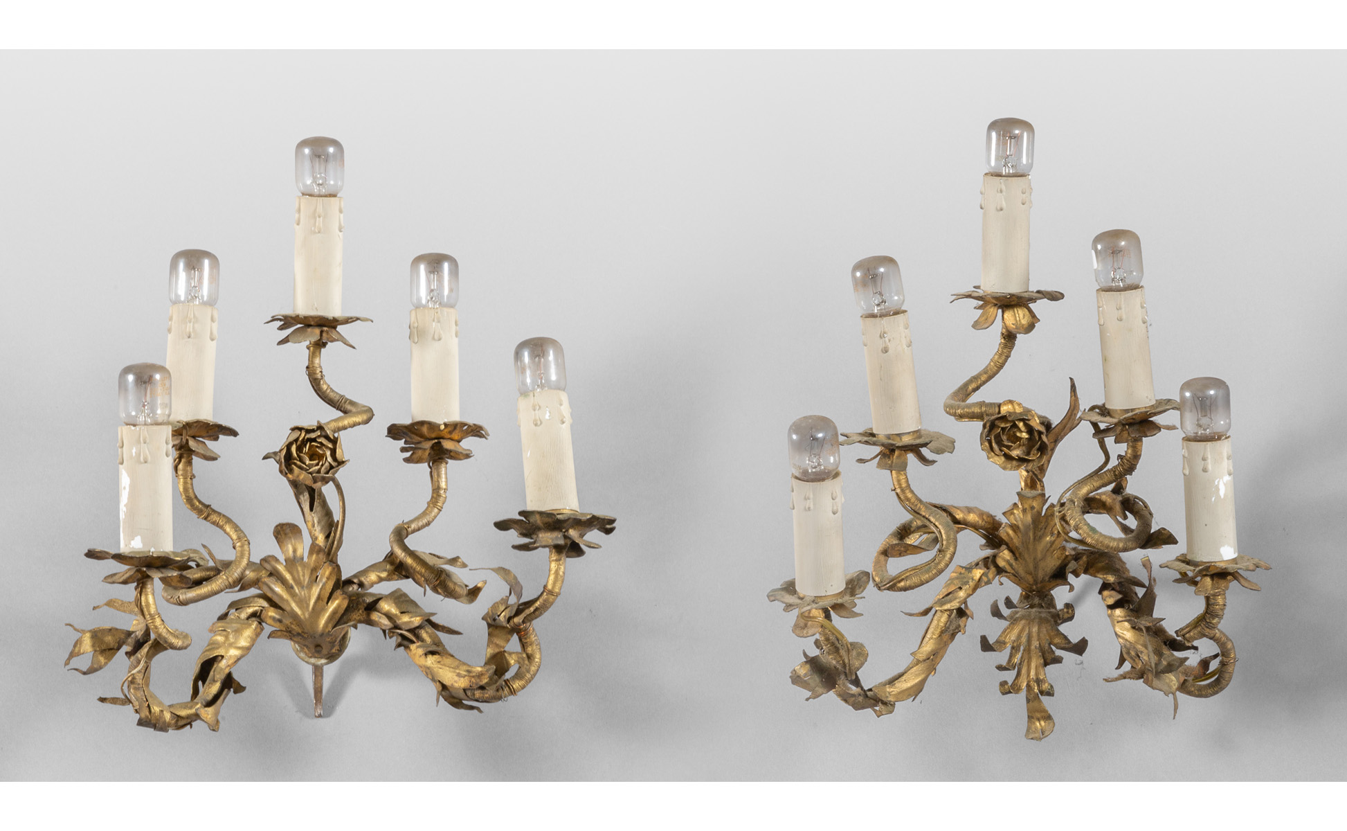 Coppia di apliques in metallo dorato a cinque luci decorate a fiorellini inizi sec.XIX