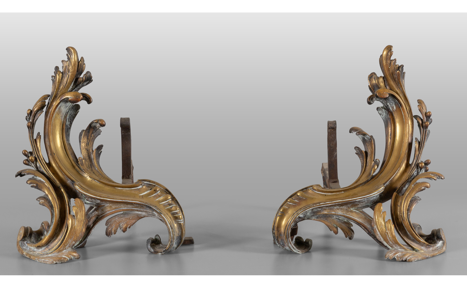 Coppia di alari in bronzo (cm.35xh.19) e parafuoco in bronzo (l.cm.122) sec.XIX