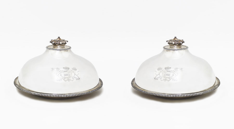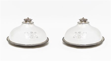 COPPIA DI LEGUMIERE IN ARGENTO Londra, Richard Sibley, 1821 piatto circolare con bordo baccellato, coperchio modellato come una cupola sormontata da corona nobiliare ed inciso con stemma gentilizio matrimoniale della famiglia di conti Sefton-Craven, lievi difetti gr 2725 PAIR OF SILVER SERVING DISHES, LONDON, RICHARD SIBLEY, 1821