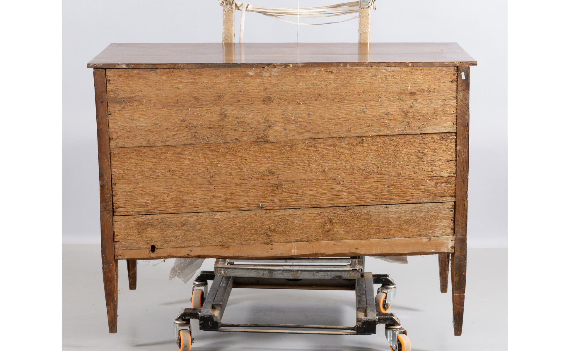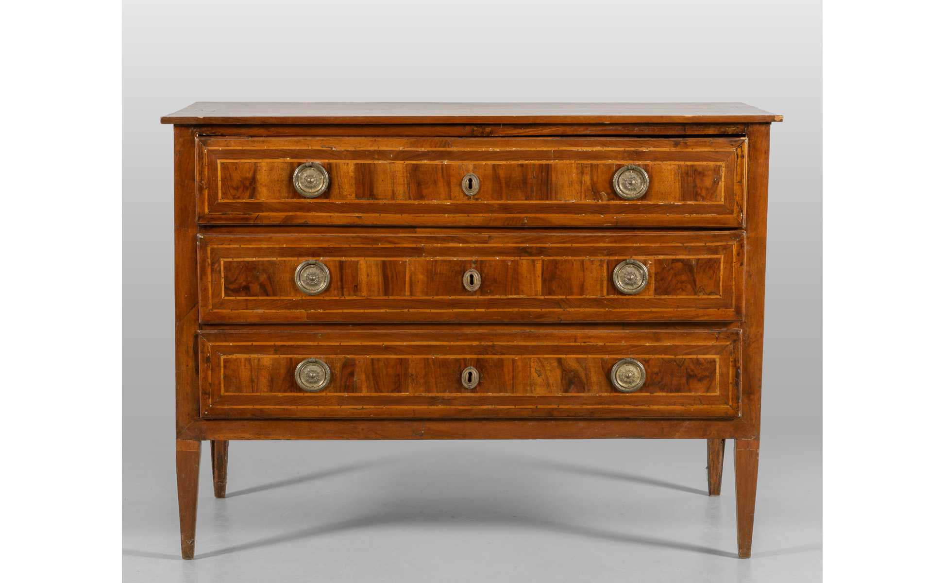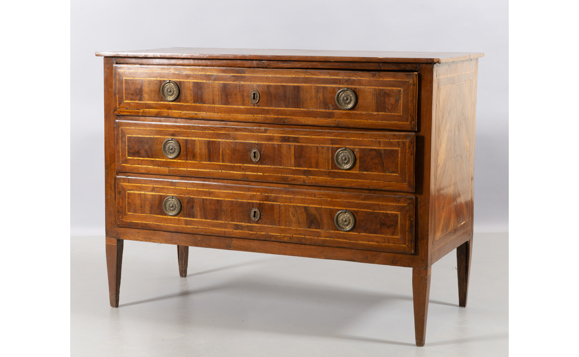 Comò direttorio lastronato in noce e filettato in acero tre cassetti piano in legno inizi sec.XIX