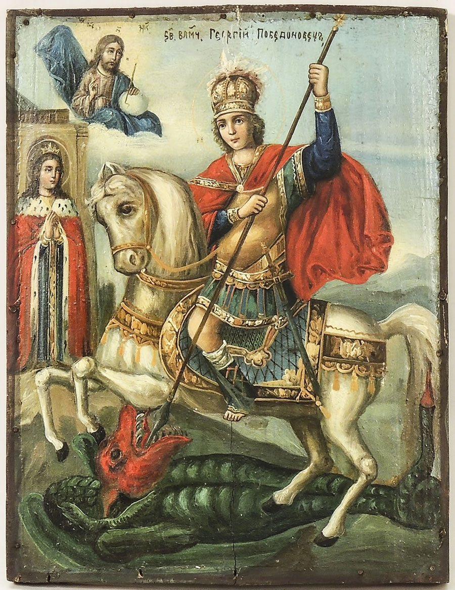 ICONA inizio del XX secolo San Giorgio che uccide il drago olio su tavola cm...