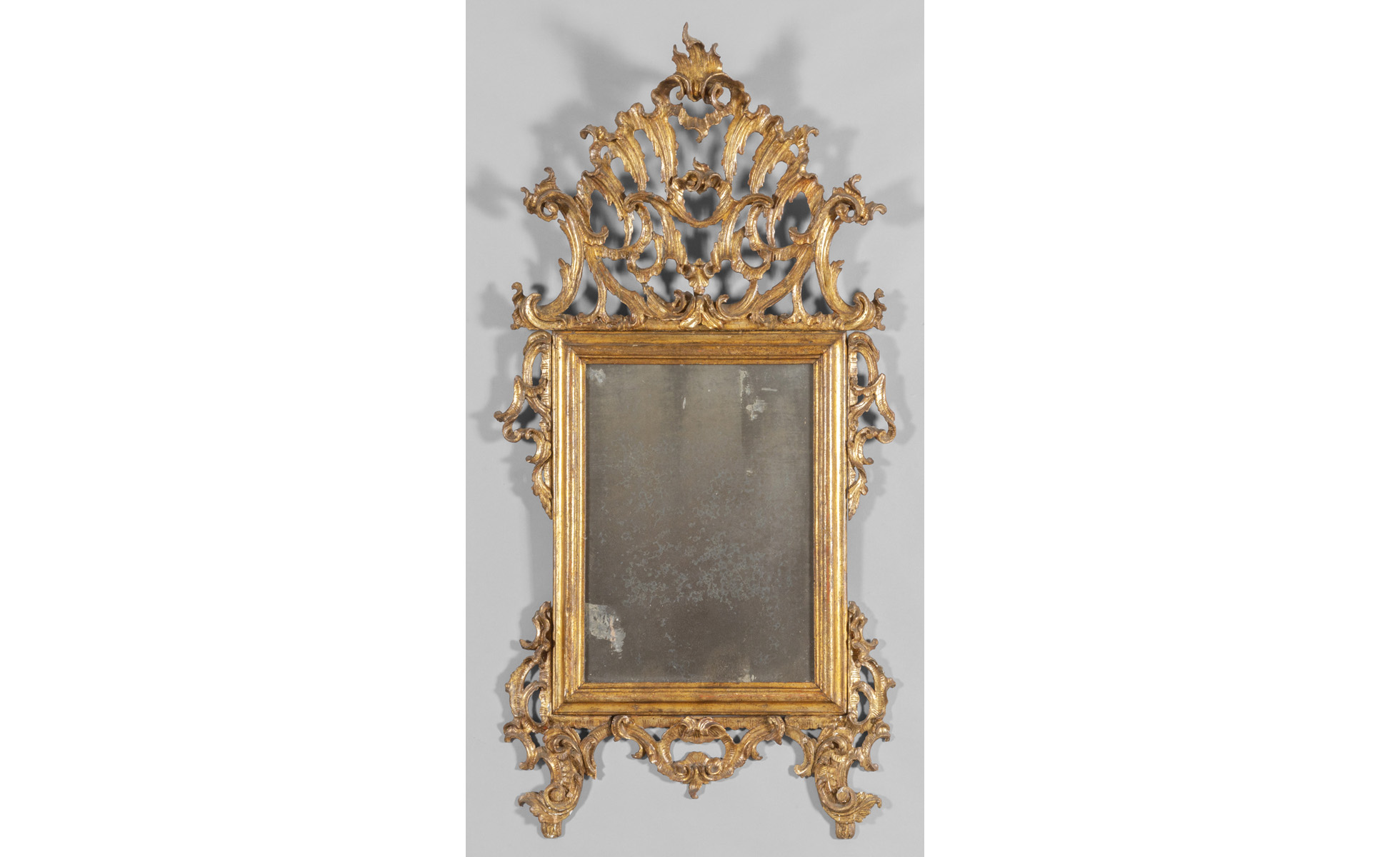 Specchiera Luigi XV in legno finemente intagliato e dorato a mecca Lombardia I metà sec.XVIII