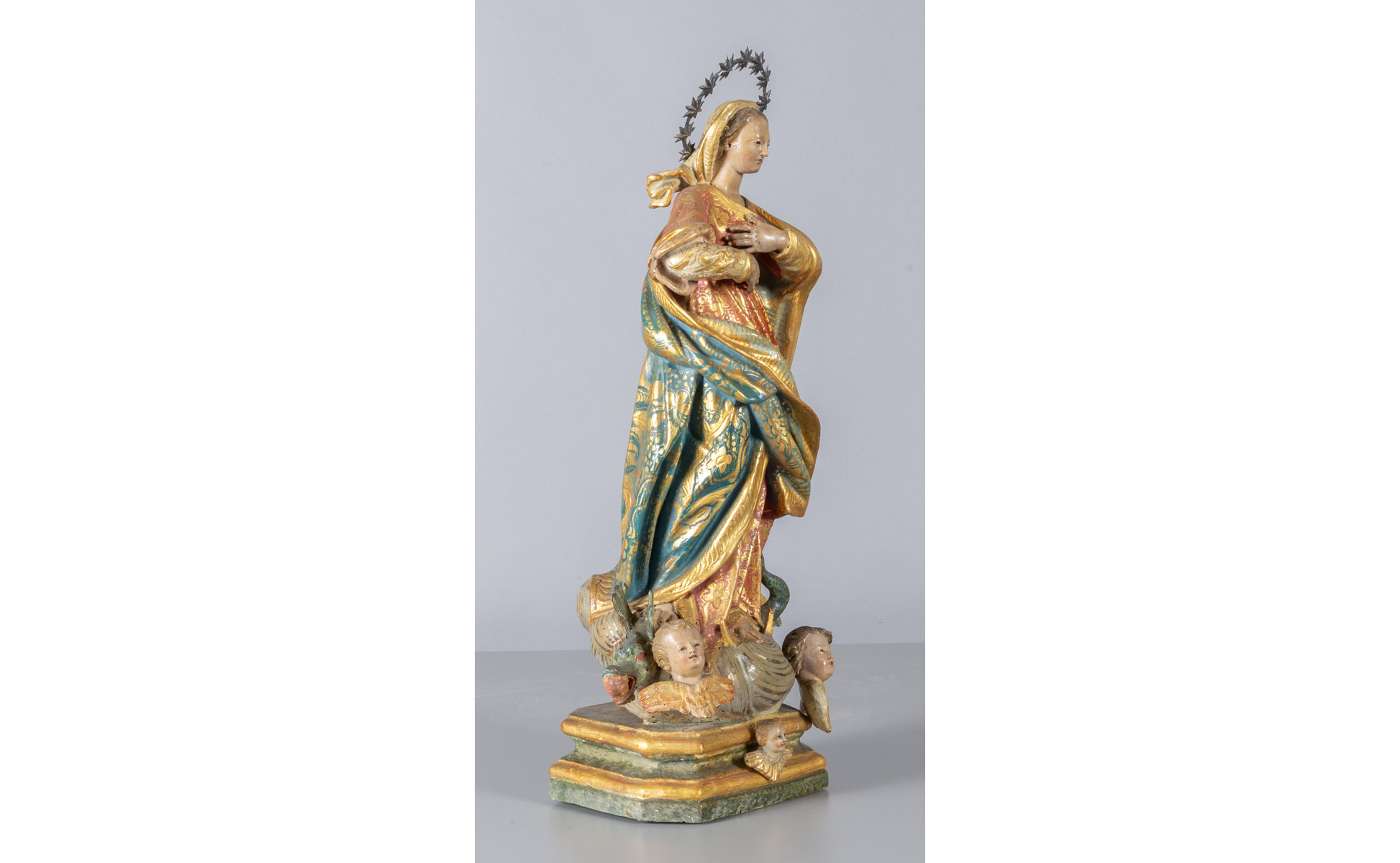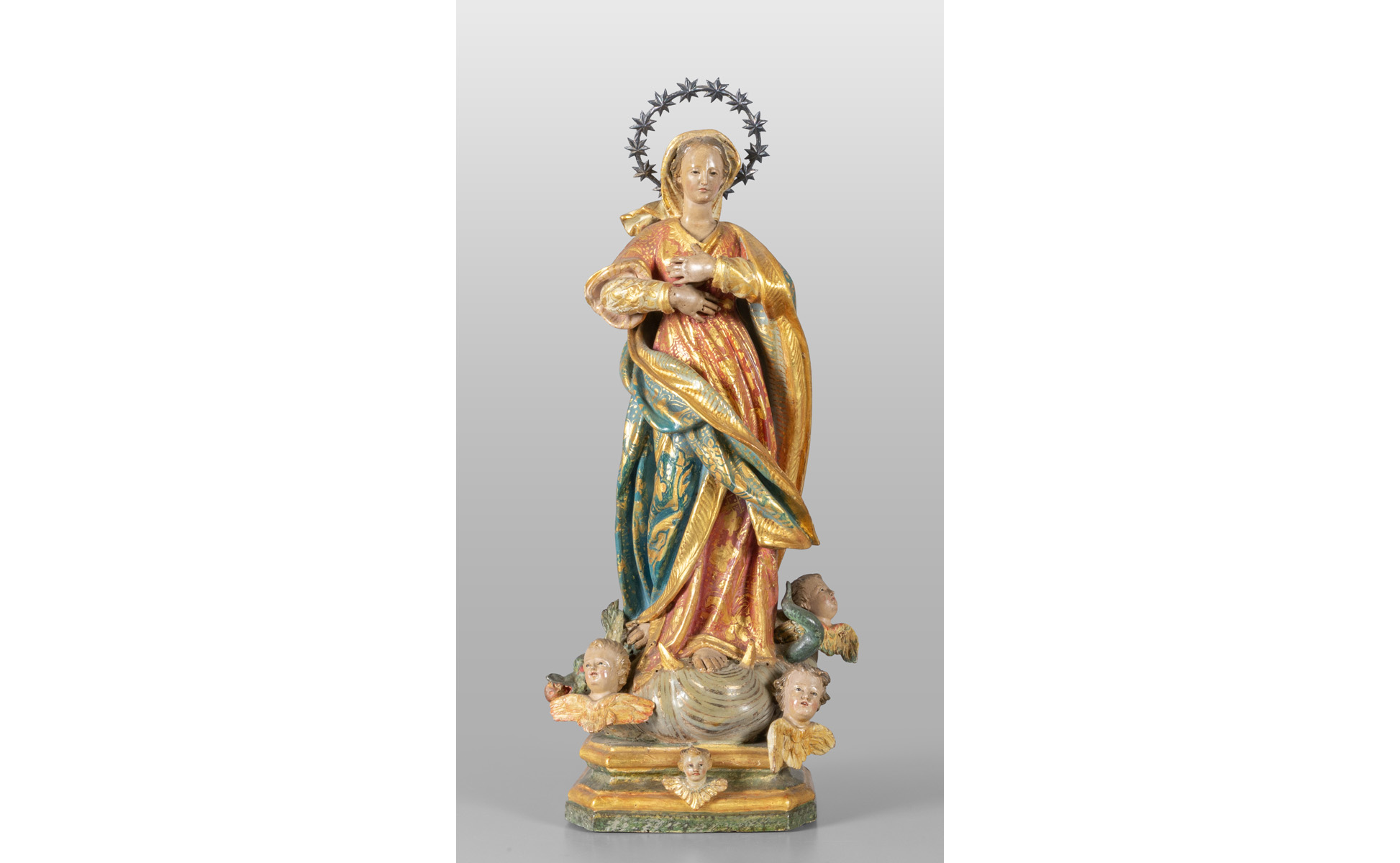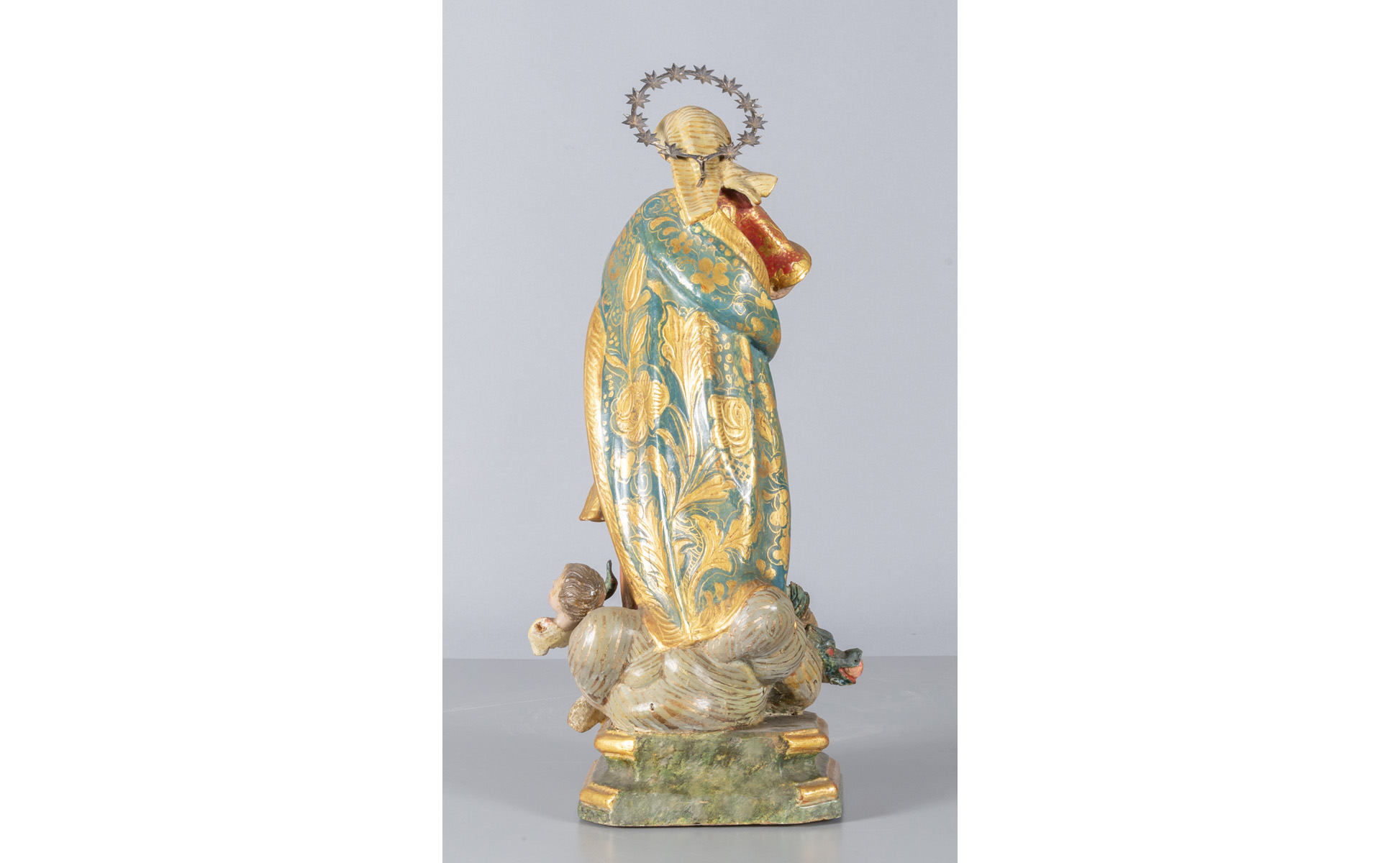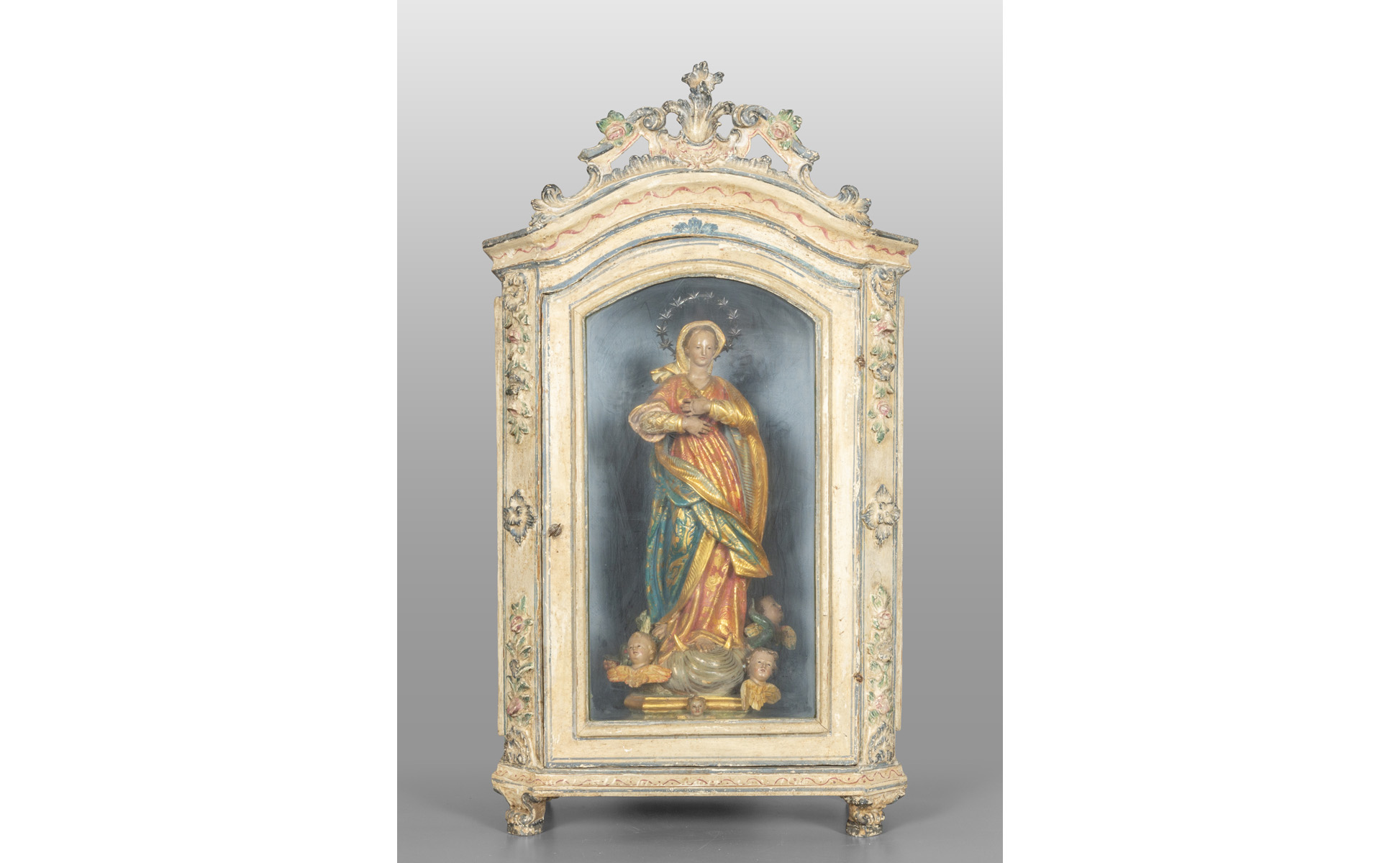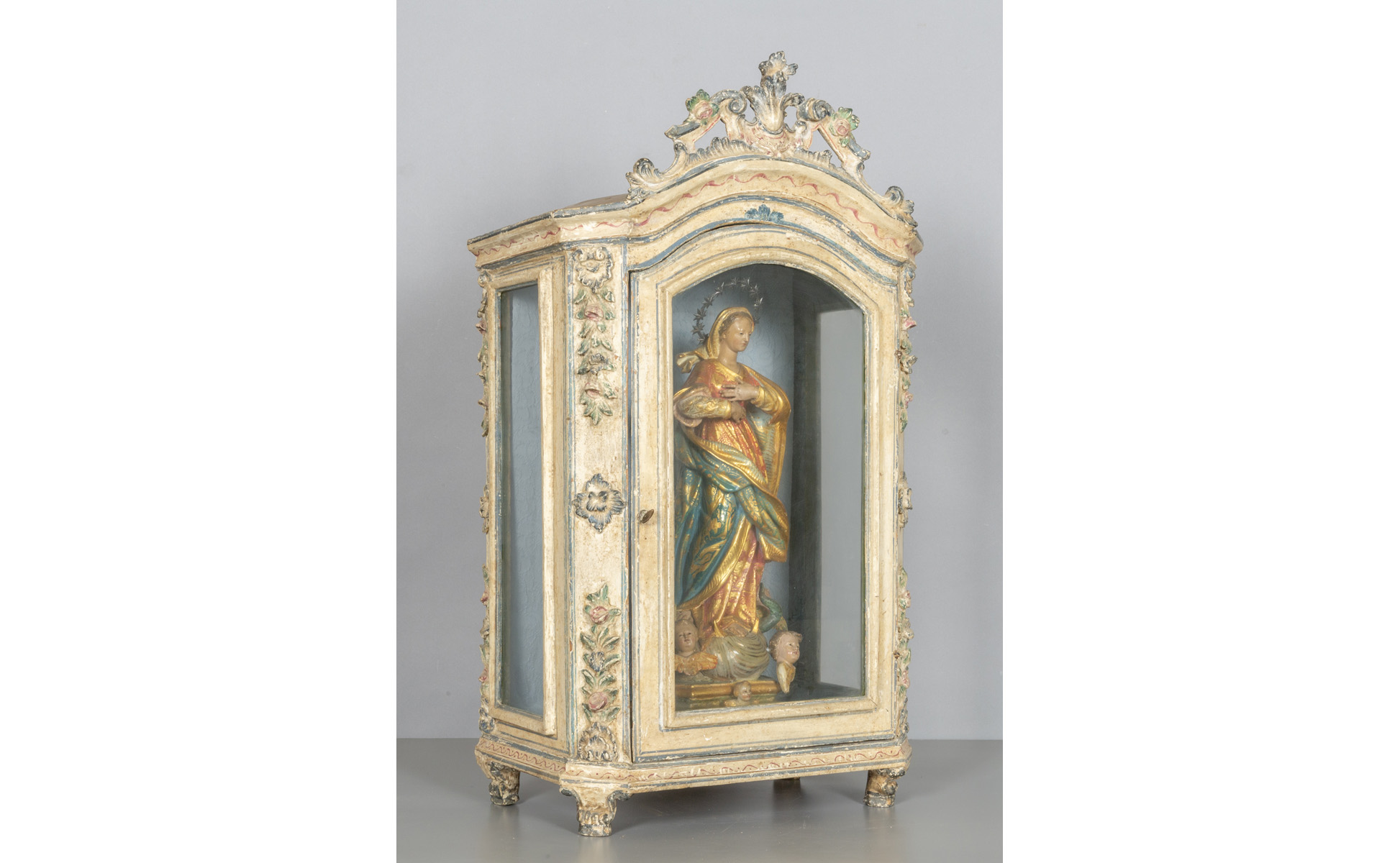 Teca Luigi XV in legno intagliato laccato e dorato contenente Madonna in legno intagliato e laccato Genova sec.XVIII