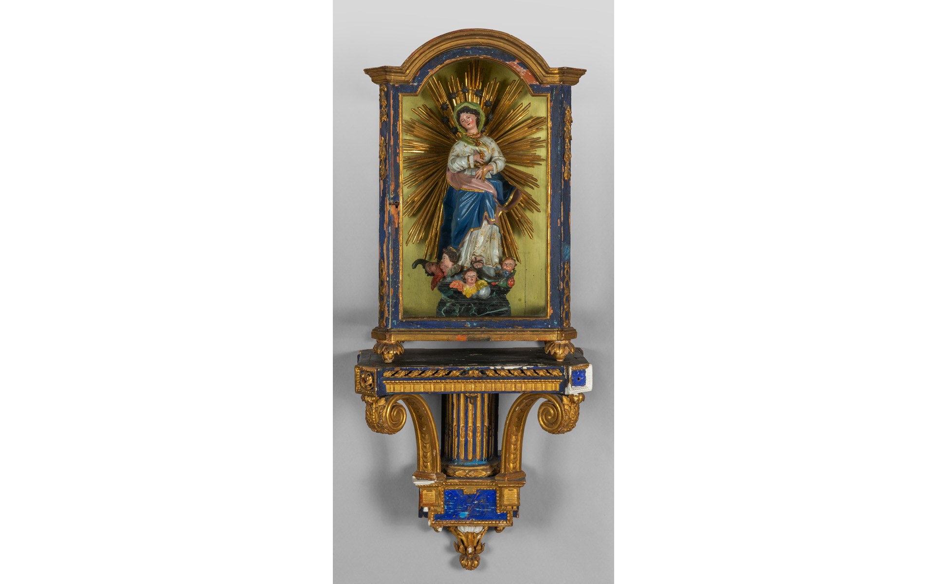 Madonna Assunta scultura in legno intagliato laccato e dorato nella sua teca con mensola in legno laccato azzurro e oro Genova II metà sec.XVIII