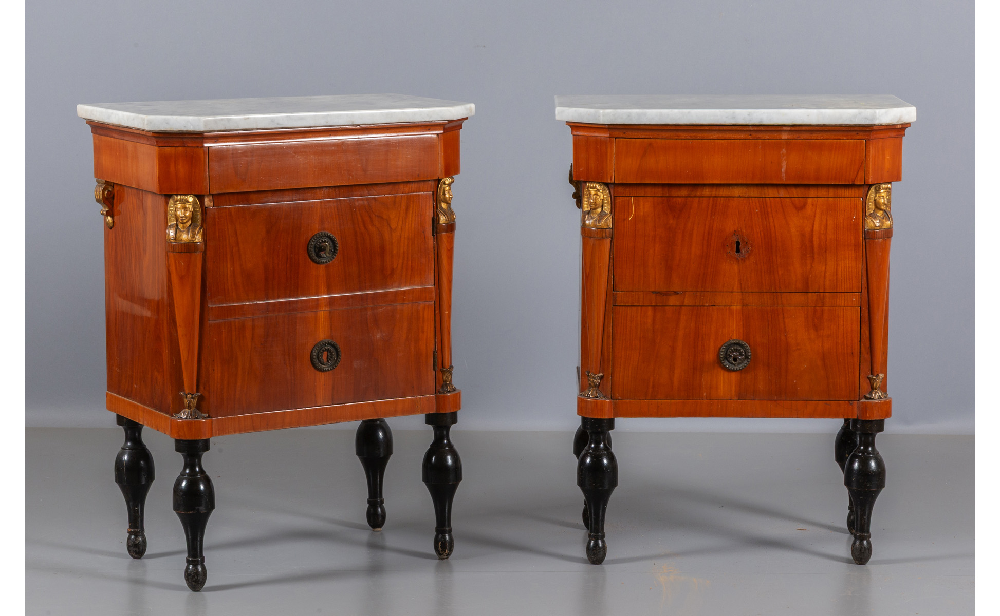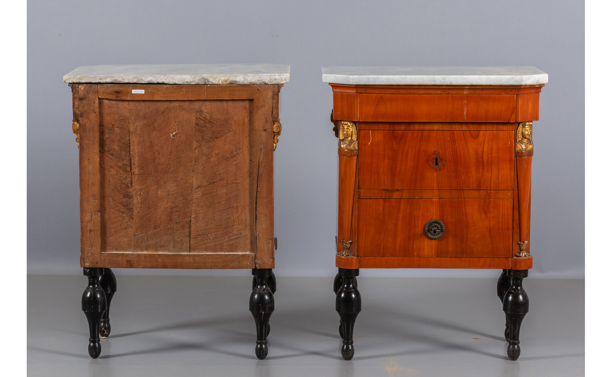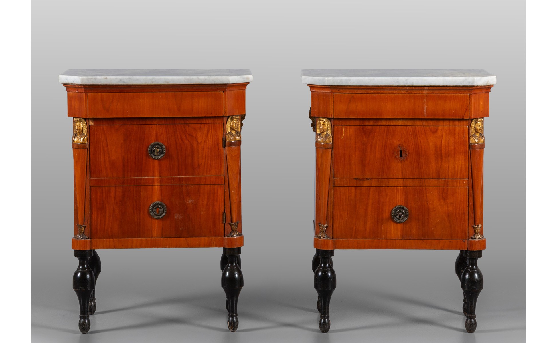 Coppia di comodini 'retour d'Egypte' in ciliegio a due cassetti più uno sul fronte montanti con colonne terminanti con sfingi piani in marmo Lucca sec.XIX