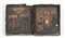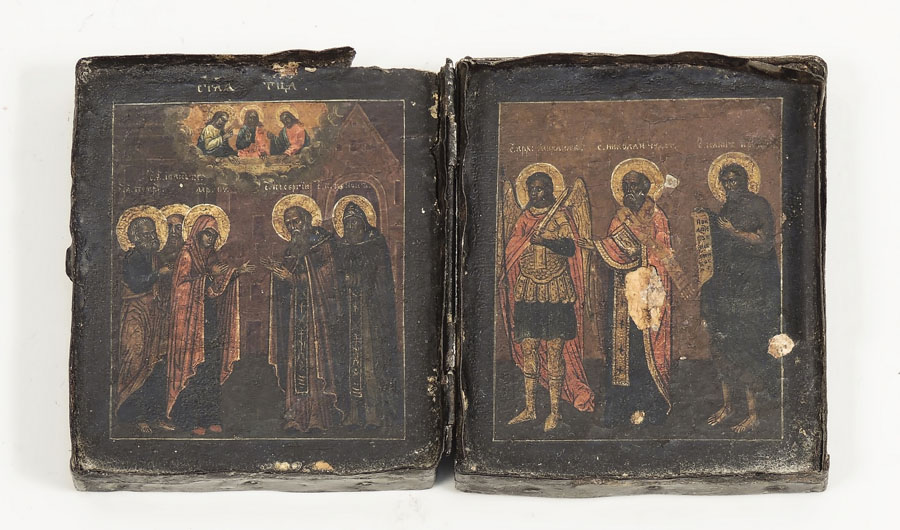 PICCOLA ICONA DA VIAGGIO Scuola russa del XIX secolo Trinità e Santi tempera su tavola a due sportelli, difetti cm 8,5x14,5 Al verso reca iscrizioni TRAVEL ICON, RUSSIAN SCHOOL OF 19TH CENTURY, TEMPERA ON PANEL, INSCRIPTIONS ON REVERSE