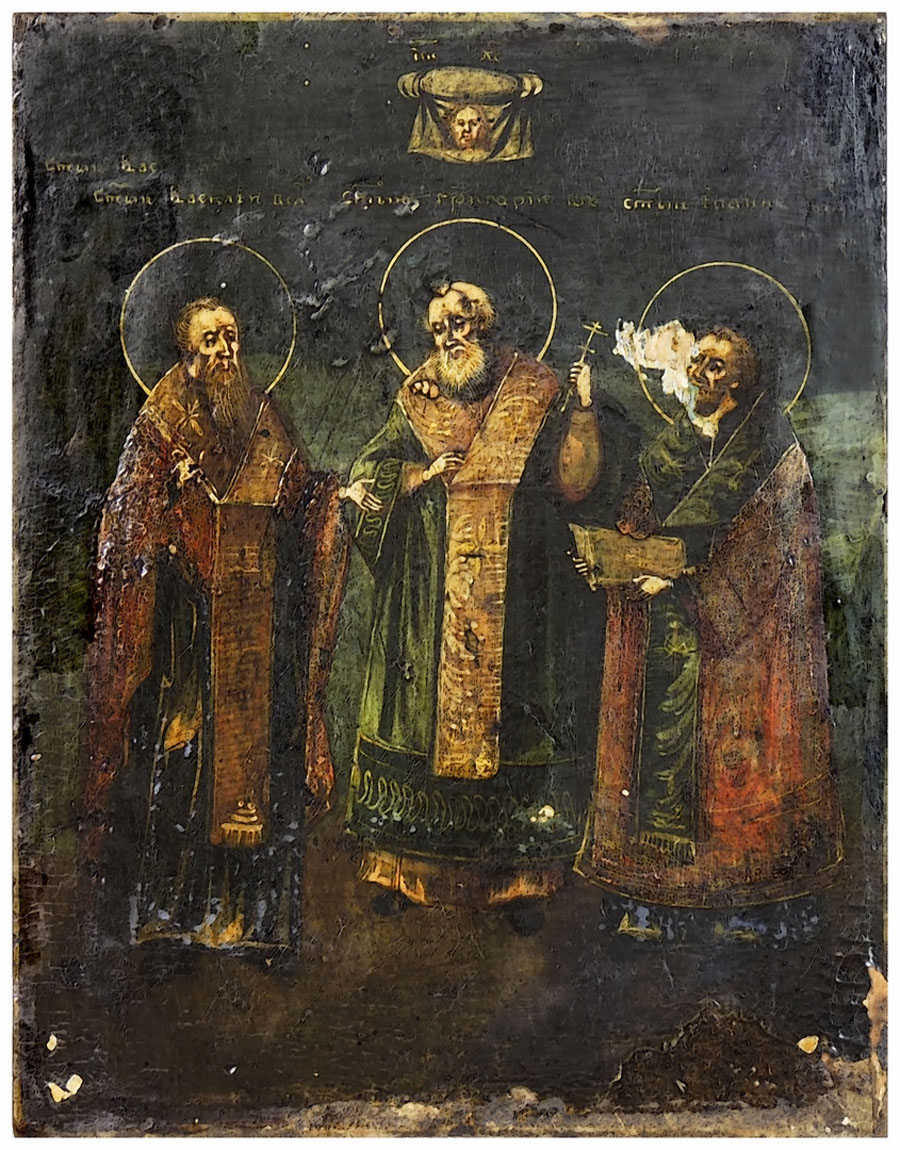 ICONA San Pietroburgo, fine del XVIII/inizio del XIX secolo I Tre Gerarchi della Chiesa: San Giovanni Crisostomo, San Basilio il Grande e San Gregorio Nazianzeno gesso e tempera all'uovo su tavola, difetti cm 21,5x17 ICON, ST. PETERSBURG, LATE 18TH/EARLY 19TH CENTURY, GYPSUM AND EGG TEMPERA ON PANEL