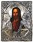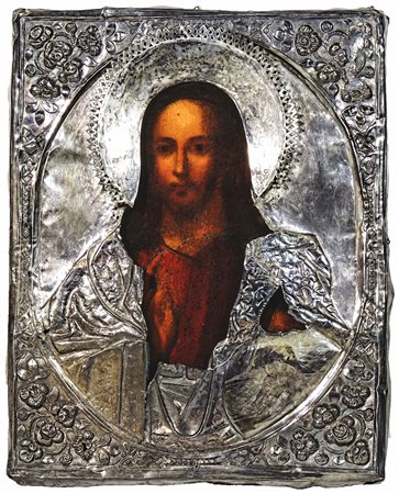 ICONA San Pietroburgo, 1870 Cristo Pantocratore olio su tavola, ritza in argento sbalzata con motivi floreali cm 22x18 Punzoni: reca punzone città di San Pietroburgo, punzone argentiere "?.?." ("P.I.") con data, punzone saggiatore "B.C." ("V.S"). Cfr: G. Watts, Russian Silversmiths' Hallmarks. Bath: 2006. p 164 ICON, ST. PETERSBURG, 1870, OIL ON PANEL, SILVER RIZA