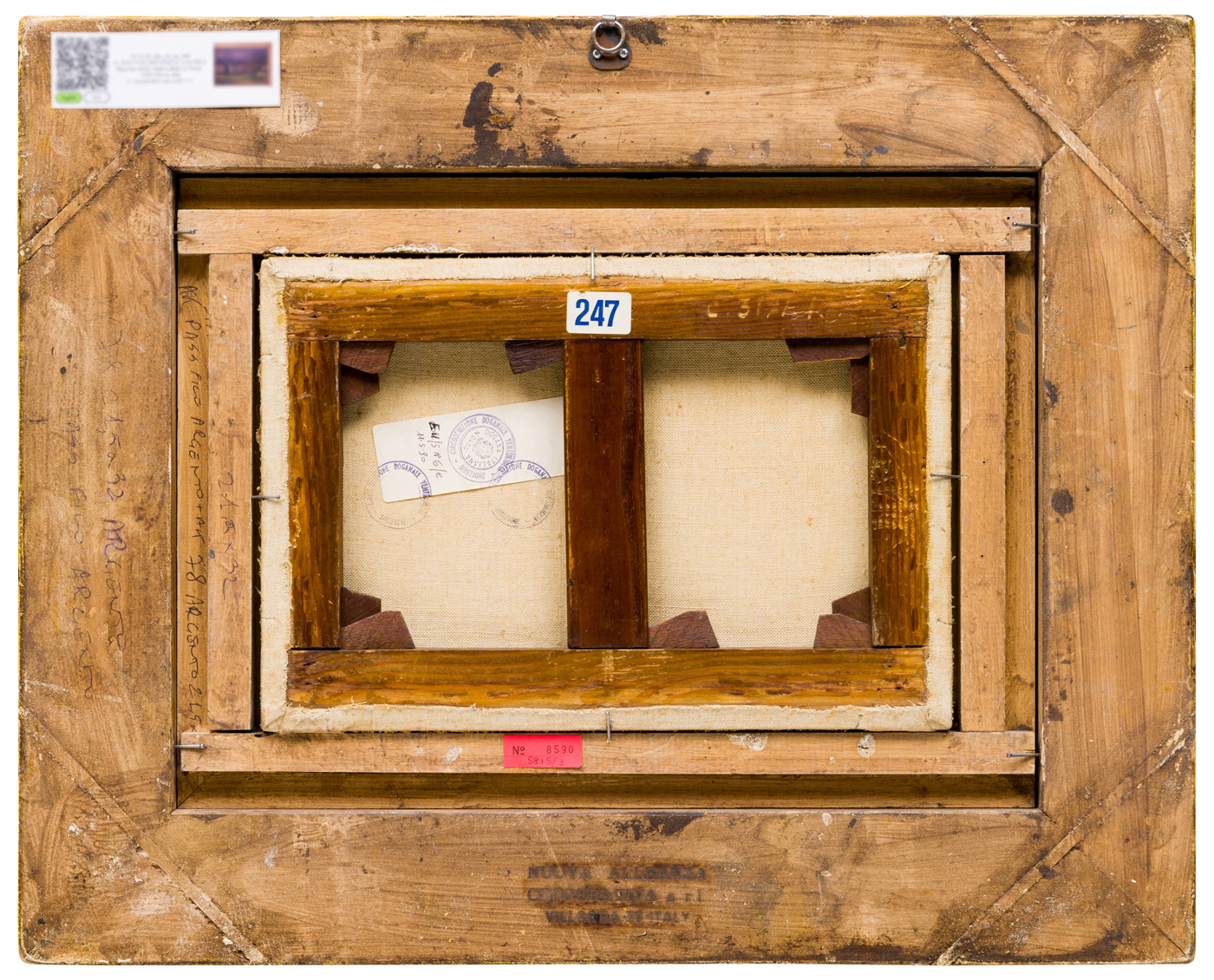 Elementi distintivi: sul verso, tre timbri della dogana di Ventimiglia con iscritto a penna “Eu/5 n. 6/e 11/5/90"; sul telaio, etichetta con numero “247” ed etichetta con numero “8590 5815/3”; sul verso della cornice timbro “Nuova alleanza cooperativa s.r. L. “ e città illeggibile; sul verso della cornice, appunti a penna relativi alla cornice