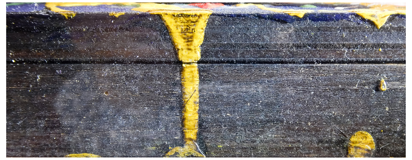 Stato di conservazione. Supporto: 90% (tarlatura sanificata nel 2021 mediante irradiazioni gamma e permetrina pura; crepe, fessure e danni da sfregamento all'involucro)