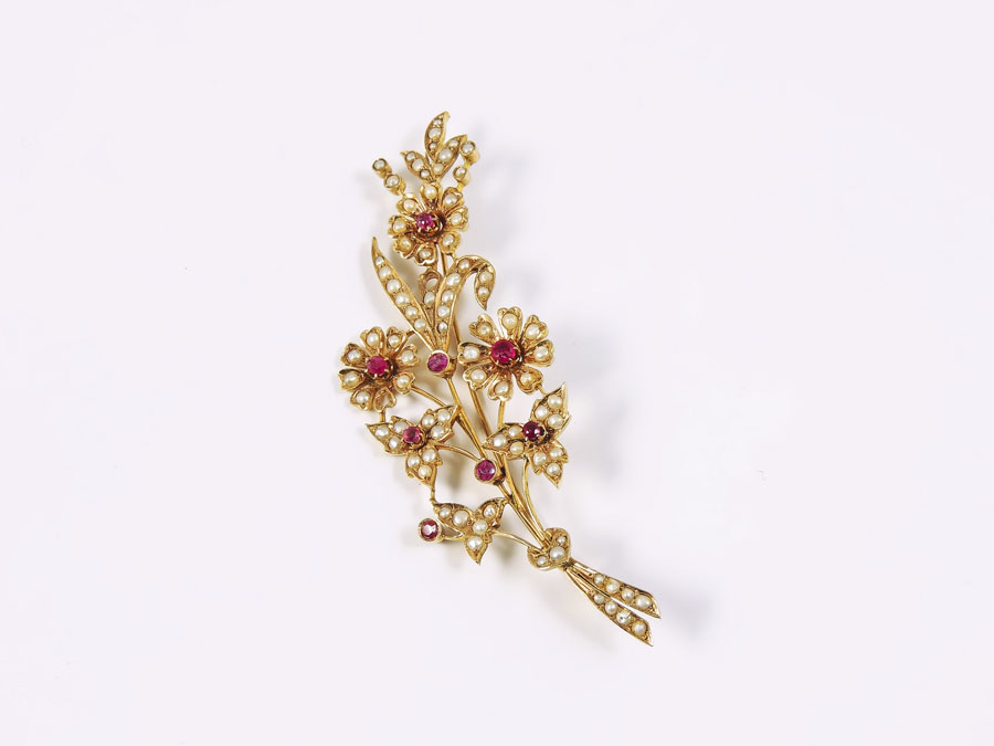 SPILLA IN ORO GIALLO, PERLE E RUBINI Anni Cinquanta realizzata come un tralcio di fiori, en pendant con la precedente gr 18,7 FLORAL BROOCH WITH RUBIES